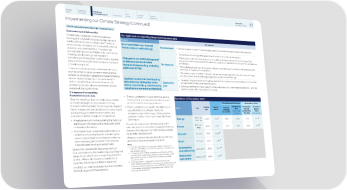 Strategic Shareholder Climate and Risk Financial Financial Barclays PLC 87 report information sustainability report Governance review review statements Annual Report 2022 Implementing our Climate Strategy (continued) TCFD Strategy Recommendation (b) | Strategic Pillar 2 Data sourcing and data quality Our approach to reporting financed emissions data Climate data, models and methodologies are Scenario Our approach evolving and not yet at the same standard as more TM traditional financial metrics. BlueTrack relies on Error identified in our internal • Financed emissions metrics for all years impacted by the error will be restated, including the baseline year. Restatement externally sourced data which is mapped to internal finance data or methodology customer and client identifiers. The externally • The updated methodology will be applied from the start of the current reporting period. sourced data has various limitations for each sector, • The last reported financed emissions spot metric will be recalculated using the new methodology / data including lack of coverage, low resolution, Changes to our methodology and/ source to provide the new baseline. This will ensure consistency of data and methodology when calculating our consistency and transparency of company reported performance. or data sources to calculate data, and the time lag for external sources to report Re-baseline financed emissions (e.g. including • The recalculated baseline and the progress achieved to date will be used to disclose the theoretical baseline estimates or actuals. for the year the targets were originally set. additional GHGs) Time lags could be as much as two years for data • The cumulative progress will be the progress for the current reporting period (using the new methodology) such as company value, company revenue share, and the progress up until the last reporting period (using the old methodology). emissions, production capacity and capacity factors. Updates to external counterparty • The impact of updated external data will be included into the current period financed emissions data and the Due to these time lags, our financed emissions progress metric for the current reporting period. data driven by timing lags when Capture in- metrics are at best an estimate of our clients' data is reported (e.g. counterparty year • Data lags are inherent to the process and Barclays will endeavour to use the latest available data . Historically activities on a given date, using the external data reported metrics will not be updated for data lags. valuations or emissions estimates) available at that point in time. Our approach to reporting financed emissions data • Energy: updated to include methane, adding Baselines at December 2022 more granularity to our estimate of the Scope 1 Given the evolving nature of climate data, models Previously reported metrics Recalculated metrics and 2 emissions for energy producers and methodologies, past period metrics may Change at Dec Theoretical Recalculated change to reflect updates. To manage the impact of Baseline Baseline • Power: updated to account for the difference in Financed Sector Unit 2021 baseline financed year metric emissions these changes, we have adopted a principles-based capacity factors (or utilisation levels) for metric (percentage emissions for for Dec 2021 approach to guide whether prior metrics and Dec 2021 (re-baselined) change) renewable power technologies, to improve the baselines should be restated or re-baselined. robustness of our intensity estimates for Power MtCO e Δ a 2 2020 75.2 58.6 -22% 59.0 75.7 Energy Generators. • A restatement will involve updating the historical (Absolute) starting point for a period and recalculating the Across both sectors, we have also updated the kgCO e/ Δ b 2 historical performance 2020 322 296 -8% 304 external dataset on production / capacity following a 331 Power MWh change in the data sourcing methodology adopted • A re-baseline will involve keeping the historical by our external data vendor. Δ performance constant and re-calculating the tCO e/t 2021 0.625 Cement 2 current period baseline to ensure consistency Under our approach (as explained above), we have when reviewing performance. The indicative published a theoretical baseline for 2020. Δ tCO e/t 2021 1.945 Steel 2 historical baseline will also be disclosed. Notes: a In calculating the 2022 metrics, we have restated the baseline for Due to this, direct like for like comparisons of Energy from 75.0 MtCO to 75.2 MtCO resulting in no impact on our 2 2 Automotive Δ year-end 2021 metrics. gCO e/km 2022 financed emissions information disclosed may not 167.2 2 manufacturing b For Power we have restated the baseline from 320 kgCO /MWh to 2 always be possible from one reporting period to 322 kgCO /MWh with a recalculated year-end 2021 number of 296 2 kgCO /MWh vs 295 kgCO /MWh with a consistent percentage another. Where information is restated or re- 2 2 Residential Δ 2 kgCO e/m 2022 32.9 reduction for 2021. 2 baselined, this will be identified or explained. real estate Δ 2022 data subject to independent Limited Assurance under ISAE(UK)3000 and ISAE3410. Current and previous limited assurance For 2022, our methodologies have been updated scope and opinions can be found within the ESG Resource Hub for for the Energy and Power sectors: further details: home.barclays/sustainability/esg-resource-hub/ reporting-and-disclosures/
