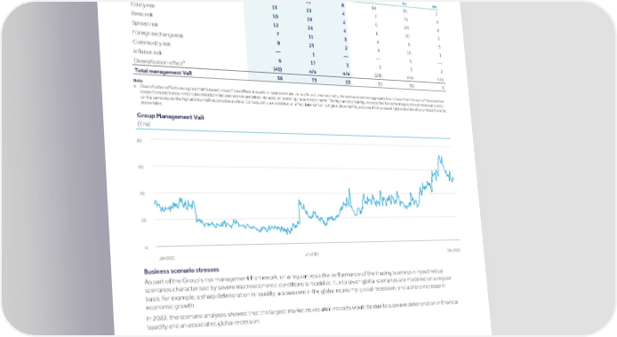 Strategic Shareholder Climate and Risk Financial Financial Barclays PLC 342 report information sustainability report Governance review review statements Annual Report 2022 Risk performance - Market risk (continued) The daily average, high and low values of management VaR Management VaR (95%, one day) (audited) 2022 2021 a a a a Average High Low Average High Low For the year ended 31 December £m £m £m £m £m £m Credit risk 25 71 8 14 30 7 Interest rate risk 13 23 4 7 15 4 Equity risk 10 29 4 9 29 4 Basis risk 12 24 4 6 10 3 Spread risk 7 11 3 4 6 3 Foreign exchange risk 8 25 2 4 16 1 Commodity risk — 1 — — 1 — Inflation risk 6 17 3 3 5 2 a (45) n/a n/a (28) n/a n/a Diversification effect 36 73 13 19 36 6 Total management VaR Note a Diversification effects recognise that forecast losses from different assets or businesses are unlikely to occur concurrently, hence the expected aggregate loss is lower than the sum of the expected losses from each area. Historical correlations between losses are taken into account in making these assessments. The high and low VaR figures reported for each category did not necessarily occur on the same day as the high and low VaR reported as a whole. Consequently, a diversification effect balance for the high and low VaR figures would not be meaningful and is therefore omitted from the above table. Group Management VaR (£m) 80 60 40 20 0 Jan 2021 Jan 2022 Dec 2022 Business scenario stresses As part of the Group’s risk management framework, on a regular basis the performance of the trading business in hypothetical scenarios characterised by severe macroeconomic conditions is modelled. Up to seven global scenarios are modelled on a regular basis, for example, a sharp deterioration in liquidity, a slowdown in the global economy, global recession, and a sharp increase in economic growth. In 2022, the scenario analyses showed that the largest market risk related impacts would be due to a severe deterioration in financial liquidity and an associated global recession.