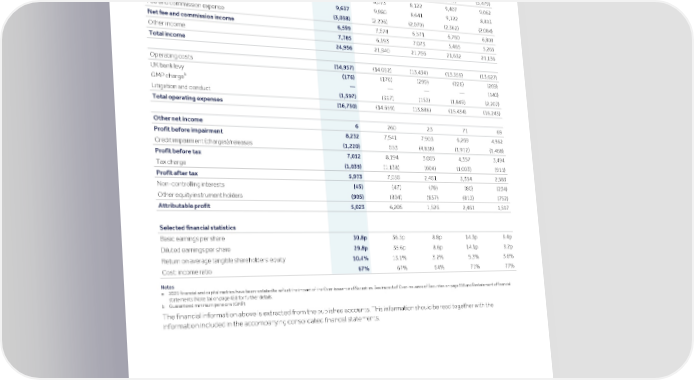 Strategic Shareholder Climate and Risk Financial Financial Barclays PLC 381 report information sustainability report Governance review review statements Annual Report 2022 Consolidated summary income statement a Restated 2022 2021 2020 2019 2018 For the year ended 31 December £m £m £m £m £m Interest income 19,096 11,240 11,892 15,456 14,541 Interest expense (8,524) (3,167) (3,770) (6,049) (5,479) Net interest income 10,572 8,073 8,122 9,407 9,062 Fee and commission income 9,637 9,880 8,641 9,122 8,893 Fee and commission expense (3,038) (2,206) (2,070) (2,362) (2,084) Net fee and commission income 6,599 7,674 6,571 6,760 6,809 Other income 7,785 6,193 7,073 5,465 5,265 Total income 24,956 21,940 21,766 21,632 21,136 Operating costs (14,957) (14,092) (13,434) (13,359) (13,627) UK bank levy (176) (170) (299) (226) (269) b GMP charge — — — — (140) Litigation and conduct (1,597) (397) (153) (1,849) (2,207) Total operating expenses (16,730) (14,659) (13,886) (15,434) (16,243) Other net income 6 260 23 71 69 Profit before impairment 8,232 7,541 7,903 6,269 4,962 Credit impairment (charges)/releases (1,220) 653 (4,838) (1,912) (1,468) Profit before tax 7,012 8,194 3,065 4,357 3,494 Tax charge (1,039) (1,138) (604) (1,003) (911) Profit after tax 5,973 7,056 2,461 3,354 2,583 Non-controlling interests (45) (47) (78) (80) (234) Other equity instrument holders (905) (804) (857) (813) (752) Attributable profit 5,023 6,205 1,526 2,461 1,597 Selected financial statistics Basic earnings per share 30.8p 36.5p 8.8p 14.3p 9.4p Diluted earnings per share 29.8p 35.6p 8.6p 14.1p 9.2p Return on average tangible shareholders’ equity 10.4% 13.1% 3.2% 5.3% 3.6% Cost: income ratio 67% 67% 64% 71% 77% Notes a 2021 financial and capital metrics have been restated to reflect the impact of the Over-issuance of Securities. See impact of Over-issuance of Securities on page 356 and Restatement of financial statements (Note 1a) on page 428 for further details. b Guaranteed minimum pensions (GMP) The financial information above is extracted from the published accounts. This information should be read together with the information included in the accompanying consolidated financial statements.