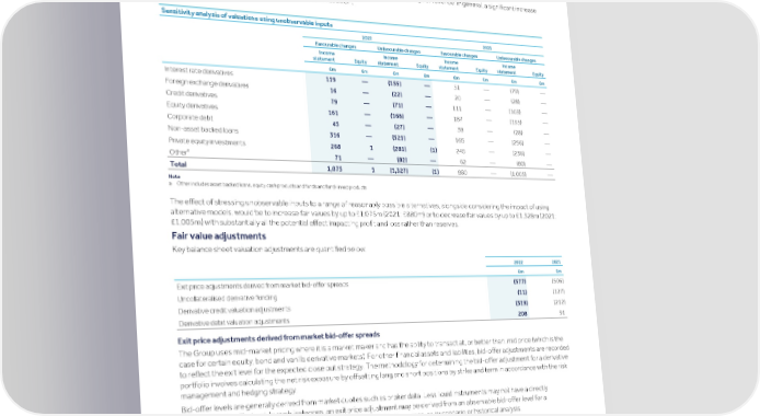 Strategic Shareholder Climate and Risk Financial Financial Barclays PLC 465 report information sustainability report Governance review review statements Annual Report 2022 Notes to the financial statements (continued) Assets and liabilities held at fair value EBITDA multiple EBITDA multiple is the ratio of the valuation of the investment to the earnings before interest, taxes, depreciation and amortisation. In general, a significant increase in the multiple will result in a fair value increase for an investment. Earnings multiple Earnings or Revenue multiple is the ratio of the valuation of the investment to the earnings or revenue. In general, a significant increase in the multiple will result in a fair value increase for an investment. Sensitivity analysis of valuations using unobservable inputs 2022 2021 Favourable changes Unfavourable changes Favourable changes Unfavourable changes Income Income Income Income statement Equity statement Equity statement Equity statement Equity £m £m £m £m £m £m £m £m Interest rate derivatives 119 — (155) — 51 — (79) — Foreign exchange derivatives 16 — (22) — 20 — (28) — Credit derivatives 79 — (71) — 111 — (103) — Equity derivatives 161 — (168) — 187 — (195) — Corporate debt 45 — (27) — 38 — (28) — Non-asset backed loans 316 — (521) — 165 — (256) — Private equity investments 268 1 (281) (1) 246 — (236) — a Other 71 — (82) — 62 — (80) — Total 1,075 1 (1,327) (1) 880 — (1,005) — Note a Other includes asset backed loans, equity cash products and funds and fund-linked products The effect of stressing unobservable inputs to a range of reasonably possible alternatives, alongside considering the impact of using alternative models, would be to increase fair values by up to £1,076m (2021: £880m) or to decrease fair values by up to £1,328m (2021: £1,005m) with substantially all the potential effect impacting profit and loss rather than reserves. Fair value adjustments Key balance sheet valuation adjustments are quantified below: 2022 2021 £m £m Exit price adjustments derived from market bid-offer spreads (577) (506) Uncollateralised derivative funding (11) (127) Derivative credit valuation adjustments (319) (212) Derivative debit valuation adjustments 208 91 Exit price adjustments derived from market bid-offer spreads The Group uses mid-market pricing where it is a market maker and has the ability to transact at, or better than, mid price (which is the case for certain equity, bond and vanilla derivative markets). For other financial assets and liabilities, bid-offer adjustments are recorded to reflect the exit level for the expected close out strategy. The methodology for determining the bid-offer adjustment for a derivative portfolio involves calculating the net risk exposure by offsetting long and short positions by strike and term in accordance with the risk management and hedging strategy. Bid-offer levels are generally derived from market quotes such as broker data. Less liquid instruments may not have a directly observable bid-offer level. In such instances, an exit price adjustment may be derived from an observable bid-offer level for a comparable liquid instrument, or determined by calibrating to derivative prices, or by scenario or historical analysis. Exit price adjustments derived from market bid-offer spreads have increased by £71m to £(577)m. Discounting approaches for derivative instruments Collateralised In line with market practice, the methodology for discounting collateralised derivatives takes into account the nature and currency of the collateral that can be posted within the relevant credit support annex (CSA). The CSA aware discounting approach recognises the ‘cheapest to deliver’ option that reflects the ability of the party posting collateral to change the currency of the collateral. Uncollateralised A fair value adjustment of £(11)m is applied to account for the impact of incorporating the cost of funding into the valuation of uncollateralised and partially collateralised derivative portfolios and collateralised derivatives where the terms of the agreement do not allow the rehypothecation of collateral received. This adjustment is referred to as the Uncollateralised derivative funding. Uncollateralised derivative funding has decreased by £116m to £(11)m as a result of underlying moves in the exposure profile of the derivative portfolio in scope.