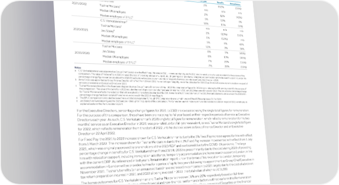 Strategic Shareholder Climate and Risk Financial Financial Barclays PLC 238 report information sustainability report Governance review review statements Annual Report 2022 Remuneration report (continued) Annual percentage change in remuneration of Directors and employees The table below shows the percentage change in the Executive Directors’ Fixed Pay, benefits and bonus each year between 2020 and 2022 compared with the percentage change in each of those components of pay for UK-based employees of Barclays Group and for employees of the Barclays PLC (BPLC), the parent company of the Group. Fixed pay Benefits Annual bonus a C.S. Venkatakrishnan 2% 853% (16%) b Anna Cross n/a n/a n/a c Tushar Morzaria 2021/2022 2% 82% (20%) Median UK employee 5% 10% 3% d Median employee of BPLC 10% 15% (2%) a C.S. Venkatakrishnan n/a n/a n/a c Tushar Morzaria 2% (10%) 152% e Jes Staley 2020/2021 1% (12%) n/a Median UK employee 5% 6% 42% d Median employee of BPLC 11% 0% 38% Tushar Morzaria 0% 9% (49%) Jes Staley 0% 10% (49%) 2019/2020 Median UK employee 7% 20% (16%) d Median employee of BPLC 7% 26% (16%) Notes a C.S. Venkatakrishnan was appointed as Group Chief Executive with effect from 1 November 2021. His remuneration figures for 2021 are pro-rated up to a full-year equivalent for the purpose of this comparison. The value of his benefits in 2022 includes the cost of providing relocation support, including immigration assistance, temporary accommodation and home search support in London. No percentage change figures can be calculated for 2020/21 as he did not receive any remuneration in respect of services provided as an Executive Director in 2020. b Anna Cross was appointed as Group Finance Director with effect from 23 April 2022. No percentage change figures can be calculated for 2021/22 as she did not receive any remuneration in respect of services provided as an Executive Director in 2021. c Tushar Morzaria retired from the Board and stepped down as Group Finance Director on 22 April 2022. His remuneration figures for 2022 are pro-rated up to a full-year equivalent for the purpose of this comparison. The value of his benefits in 2022 includes the cost of advice on tax return preparation incurred in 2021 and 2022 that were all invoiced in 2022. The annual bonus percentage change for Tushar Morzaria reflects the reduction that will be applied to the deferred elements of his 2021 bonus, to reflect the restatement of the 2021 financial statements, and as a result the 2020/2021 percentage change has been restated from the value disclosed in the 2021 Annual Report. d The BPLC comparison is included because this is a statutory requirement, though BPLC employs only a very small number of Head Office employees (51 for 2022). e Jes Staley's remuneration figures for 2021 are pro-rated up for the purpose of this comparison. The Committee has not made any remuneration decisions to date in respect of 2021 variable pay, as explained earlier in this Remuneration report. For the Executive Directors, percentage change figures for 2021 to 2022 are calculated using the single total figures for remuneration. For the purpose of this comparison, these have been pro-rated up to full year based on their respective periods of service as Executive Directors each year. As such, C.S. Venkatakrishnan’s 2021 single total figure for remuneration, which reflects remuneration for his two months’ service as an Executive Director in 2021, was pro-rated up to a full-year equivalent, as was Tushar Morzaria’s single total figure for 2022, which reflects remuneration from the start of 2022 until he stepped down as Group Finance Director and an Executive Director on 22 April 2022. For Fixed Pay, the 2021 to 2022 increase shown for C.S. Venkatakrishnan is due to the 3% Fixed Pay increase agreed for him with effect from 1 March 2022. The increase shown for Tushar Morzaria is due to the 4.5% Fixed Pay increase implemented with effect from 1 July 2021, which was originally approved by shareholders at the 2020 AGM and postponed due to the COVID-19 pandemic. The large percentage change in benefits for C.S. Venkatakrishnan from 2021 to 2022 is predominantly due to the cost during 2022 of providing him with relocation support, including immigration assistance, temporary accommodation and home search support in London, in line with the current DRP. As referenced in last year's Remuneration report, under the terms of his relocation to London, temporary accommodation in London will be provided to him for a period of up to two years following his appointment as Group Chief Executive in November 2021. Tushar’s benefits (on an annualised basis) have increased in comparison to 2021 largely due to the cost of advice on tax return preparation incurred in 2021 and 2022 all being invoiced in 2022, the total value of which is c.£15,000. The bonus outcomes for C.S. Venkatakrishnan and Tushar Morzaria are down 16% and 20% respectively (based on full-time equivalents each year). This is reflective of the financial and non-financial performance factors outlined earlier in this Remuneration report, in the section on the 2022 annual bonus outcomes, including the impact of the Over-issuance of Securities on the financial results for 2022. For UK employees across the Group overall, the 5% increase in median fixed pay reflects increases awarded during 2022 in the normal course of business and the decision taken to bring forward part of the 2023 pay increase, to give 35,000 UK-based junior colleagues a £1,200 salary increase effective from August 2022 to provide support to colleagues in light of high cost-of-living inflation, ahead of our annual salary review (which will be effective 1 March 2023). The increase in benefits is largely due an increase in the cost to Company of income protection and private medical insurance. For bonus, although the overall incentives pool is down on 2021, the Committee chose to focus the reductions on more-senior colleagues so 