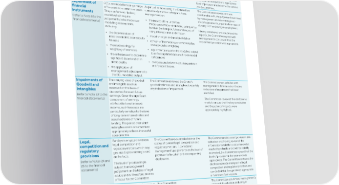 Strategic Shareholder Climate and Risk Financial Financial Barclays PLC 173 report information sustainability report Governance review review statements Annual Report 2022 Directors’ report: Board Audit Committee report (continued) Areas of focus Matters addressed Role of Committee Conclusion/action taken Barclays makes certain With a view to evaluating the adequacy of the The Committee scrutinised management’s Conduct assumptions and estimates, provisions, the Committee analysed the approach to conduct provisions provisions analysis of which underpins judgements and estimates made with regards throughout the year and was satisfied that (refer to Note 24 to the provisions made for the costs of to Barclays' provisioning for legacy conduct management's judgement and approach financial statements) customer redress. issues. resulted in an adequate and appropriate level of provision in relation to the various conduct matters. ECLs are modelled using a range As part of its monitoring, the Committee The Committee reviewed, and was Impairment of of forecast economic scenarios. considered a number of reports from comfortable with, the judgement exercised financial They use forward-looking management on: by management in determining post- instruments models which require model adjustments, in particular in view of • the impact of the uncertain (refer to Note 8 to the judgements to be made over slowing GDP and rising unemployment. macroeconomic environment, delinquency financial statements) modelling assumptions, levels in the loan portfolios and impact of Having considered and scrutinised the including: rising interest rates and inflation reports, the Committee agreed with • the determination of management’s conclusion that the • model changes and model validation macroeconomic scenarios to impairment provision was appropriate. • refresh of the macroeconomic variables be used and associated weighting • the methodology for • adjustments made to the modelled output weighting of scenarios to reflect updated data and known model • the criteria used to determine deficiencies significant deterioration in • comparisons between actual experience credit quality and forecast losses. • the application of management adjustments to the ECL modelled output. The carrying value of goodwill The Committee reviewed the Group's The Committee was satisfied with Impairments of and intangible assets is goodwill balances and intangibles to identify management's determination that no Goodwill and assessed on the basis of any indicators of impairment. indicators of impairment had been Intangibles discounted forecast future identified. (refer to Note 22 to the earnings. Given the significant The Committee reviewed the disclosures financial statements) component of earnings made to ensure that the key sensitivities attributable to net interest and the potential impacts were income, such forecasts are appropriately highlighted. particularly sensitive to the level of long-term interest rates and assumed levels of future lending. The period over which intangible assets are amortised appropriately reflects the useful economic life. Barclays is engaged in various The Committee evaluated advice on the The Committee discussed provisions and Legal, legal, competition and status of current legal, competition and utilisation and, having reviewed the competition and regulatory matters which may regulatory matters. It considered information available to determine what regulatory give rise to provisioning based management’s judgements on the level of was both probable and could be reliably provisions on the facts. provision to be taken and accompanying estimated, the Committee agreed that the (refer to Notes 24 and disclosures. level of provision at the year end was The level of provisioning is 26 to the financial appropriate. The Committee reviewed the subject to management statements) disclosures made in respect of legal, judgement on the basis of legal competition and regulatory matters and advice and is, therefore, an area concluded that they provided appropriate of focus for the Committee. information for investors. Barclays exercises judgement in The Committee: The Committee scrutinised management's Valuations the valuation and disclosure of approach to valuation, including in (refer to Notes 13 to • evaluated reports outlining the Group's financial instruments, derivative particular the Principal Investments and 17 to the financial material valuation judgements assets and certain portfolios, Leverage Finance portfolios. statements) • received reports of the Valuation particularly where quoted The Committee was satisfied with the Committee. market prices are not available. accounting treatment in respect of the various matters. The Committee reviewed the disclosures made to ensure that the Level 3 sensitivities and the potential impacts were appropriately highlighted.