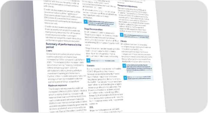 Strategic Shareholder Climate and Risk Financial Financial Barclays PLC 301 report information sustainability report Governance review review statements Annual Report 2022 Risk performance - Credit risk (continued) Credit quality Charge Credit risk A gradual increase in delinquencies has Credit impairment charges were £1,220m All disclosures in this section are unaudited been observed driven by resumption of (2021: £(653)m release). The charges unless otherwise stated. more regular spend activity in retail. A range reflect an updated macroeconomic Overview of activities are in progress to protect our scenario together with a partial return to Credit risk represents a significant risk to existing defensive positioning against the more normalised levels of customer current macroeconomic headwinds. behaviour. the Group and mainly arises from exposure Gross exposures for government to wholesale and retail loans and advances Management Adjustments supported loan schemes stands at £8bn as together with the counterparty credit risk Macroeconomic uncertainty PMAs at 31 at 2022 (2021: £11.4bn). arising from derivative contracts entered December 2022 amount to £317m (2021: with clients. In wholesale, loans to high-risk sectors as £1,692m). The reduction is informed by the release of COVID-19 related adjustments well as the broader portfolio benefited from Credit risk disclosures include many of the as credit performance stabilises at or below high-quality exposure and credit recommendations of the Taskforce on pre-pandemic levels which is reflected in protection. Disclosures about Expected Credit Losses the models, and a rebuild of certain models (DECL) and it is expected that relevant Further analysis on the credit quality of assets is to better capture the macroeconomic + presented in the approach to management and disclosures will continue to be developed in representation of credit quality section. outlook. Refer to the Management future periods. adjustment to models for impairment Credit risk disclosures exclude other Stage Decomposition section on page 315 for further details. financial assets not subject to credit risk, A net increase of £5.6bn is observed in Refer to the Management adjustment to models for + mainly equity securities. For off-balance Stage 2 gross exposures driven by a weaker impairment section on page 315 for further details. sheet exposures certain contingent macroeconomic forecast in wholesale liabilities not subject to credit risk such as lending (£4.5bn) and normalisation of PDs in Climate performance guarantees are excluded. retail lending (£1.1bn), predominantly credit Whilst there have been no separately cards. Summary of performance in the identifiable charges relating to climate risk in the 2022 reported ECL, it is period Stage 3 balances have decreased by £0.2bn acknowledged that impairment could to £7.1bn compared to 2021 primarily Loans increase over time as risks become more driven by write-offs partially offset by Gross loans and advances at amortised tangible and impact consumers and clients delinquencies in retail unsecured lending. cost to customers and banks have through physical risk or via impacts from increased by £37bn compared to £367bn in Refer to pages 313 to 314 for further details. + the transition to a low carbon economy. 2021. This includes £14bn increase in debt Further detail can be found in the Financial securities driven by Treasury investments. Scenario + statements section in Note 8 Credit impairment Of the remaining growth, £21bn is charges/(releases). Description of terminology can During the year, the economic risk from the be found in the glossary, available at home.barclays/ attributable to strong lending activity in COVID-19 pandemic has receded; annualreport. investment banking and home loans. however, economic uncertainty linked to Further, £9bn in credit cards and unsecured high inflation in major economies and Refer to credit risk management section for the lending is driven by increased customer + details of governance, policies and procedures. heightened geopolitical tensions persists. spending and strategic acquisitions. For Q422, macroeconomic scenarios have Maximum exposure been refreshed and are designed around a broad range of economic outcomes. The The Group’s net exposure to credit risk Downside 2 scenario has been updated increased 13% to £1,033bn (2021: £912bn) with reference to the most recent BoE which is mainly driven by increase in off- Annual Cyclical Scenarios (ACS) stress test. balance sheet loan commitments (£53bn), This has resulted in a movement in weights cash collateral and settlement balances from the upside scenarios to the downside (£20bn), cash held at central banks (£18bn) scenarios. and debt securities issued by governments (£13bn), all of which are considered to be ECL lower risk. Overall, the extent to which the Impairment allowances on loans and Group held mitigation against its total advances at amortised cost including off- exposure remained stable at 44% (2021: balance sheet has decreased to £6,175m 44%). (2021:£6,284m) primarily driven by write- offs. On-balance sheet coverage has reduced to 1.4% (2021: 1.6%) due to movement in portfolio mix towards lower ECL balances, revised recovery expectations and evolving macroeconomic scenarios. Coverage levels remain strong.