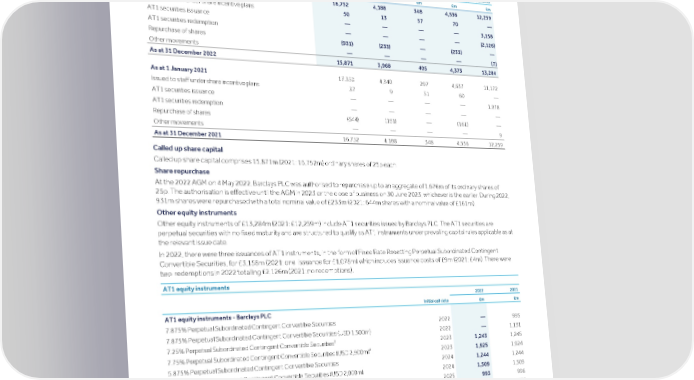 Strategic Shareholder Climate and Risk Financial Financial Barclays PLC 488 report information sustainability report Governance review review statements Annual Report 2022 Notes to the financial statements (continued) Capital instruments, equity and reserves 28 Ordinary shares, share premium, and other equity Called up share capital, allotted and fully paid Ordinary share Ordinary share Total share capital Other Number of shares capital premium and share premium equity instruments m £m £m £m £m As at 1 January 2022 16,752 4,188 348 4,536 12,259 Issued to staff under share incentive plans 50 13 57 70 — AT1 securities issuance — — — — 3,158 AT1 securities redemption — — — — (2,126) Repurchase of shares (931) (233) — (233) — Other movements — — — — (7) As at 31 December 2022 15,871 3,968 405 4,373 13,284 As at 1 January 2021 17,359 4,340 297 4,637 11,172 Issued to staff under share incentive plans 37 9 51 60 — AT1 securities issuance — — — — 1,078 AT1 securities redemption — — — — — Repurchase of shares (644) (161) — (161) — Other movements — — — — 9 As at 31 December 2021 16,752 4,188 348 4,536 12,259 Called up share capital Called up share capital comprises 15,871m (2021: 16,752m) ordinary shares of 25p each. Share repurchase At the 2022 AGM on 4 May 2022, Barclays PLC was authorised to repurchase up to an aggregate of 1,676m of its ordinary shares of 25p. The authorisation is effective until the AGM in 2023 or the close of business on 30 June 2023, whichever is the earlier. During 2022, 931m shares were repurchased with a total nominal value of £233m (2021: 644m shares with a nominal value of £161m). Other equity instruments Other equity instruments of £13,284m (2021: £12,259m) include AT1 securities issued by Barclays PLC. The AT1 securities are perpetual securities with no fixed maturity and are structured to qualify as AT1 instruments under prevailing capital rules applicable as at the relevant issue date. In 2022, there were three issuances of AT1 instruments, in the form of Fixed Rate Resetting Perpetual Subordinated Contingent Convertible Securities, for £3,158m (2021: one issuance for £1,078m) which includes issuance costs of £9m (2021: £4m). There were two redemptions in 2022 totalling £2,126m (2021: no redemptions). AT1 equity instruments 2022 2021 Initial call date £m £m AT1 equity instruments - Barclays PLC — 7.875% Perpetual Subordinated Contingent Convertible Securities 2022 995 — 7.875% Perpetual Subordinated Contingent Convertible Securities (USD 1,500m) 2022 1,131 a 1,243 7.25% Perpetual Subordinated Contingent Convertible Securities 2023 1,245 a 1,925 7.75% Perpetual Subordinated Contingent Convertible Securities (USD 2,500m) 2023 1,924 1,244 5.875% Perpetual Subordinated Contingent Convertible Securities 2024 1,244 1,509 8% Perpetual Subordinated Contingent Convertible Securities (USD 2,000m) 2024 1,509 a 993 7.125% Perpetual Subordinated Contingent Convertible Securities 2025 996 996 6.375% Perpetual Subordinated Contingent Convertible Securities 2025 996 a 1,142 6.125% Perpetual Subordinated Contingent Convertible Securities (USD 1,500m) 2025 1,141 1,078 4.375% Perpetual Subordinated Contingent Convertible Securities (USD 1,500m) 2028 1,078 264 8.300% Perpetual Subordinated Contingent Convertible Securities (SGD 450m) 2027 — 1,247 8.875% Perpetual Subordinated Contingent Convertible Securities 2027 — a 8.000% Perpetual Subordinated Contingent Convertible Securities (USD 2,000m) 2029 1,643 — Total AT1 equity instruments 13,284 12,259 Note a Reported net of securities held by the Group.