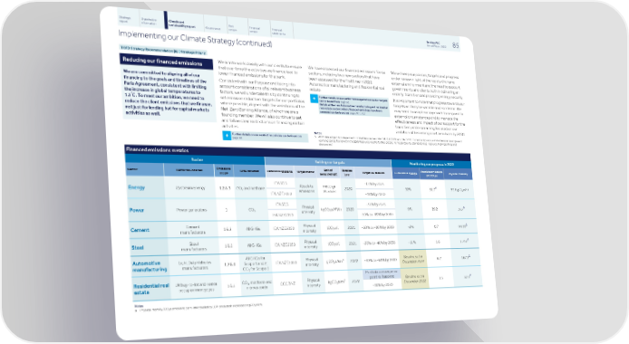 Strategic Shareholder Climate and Risk Financial Financial Barclays PLC 85 report information sustainability report Governance review review statements Annual Report 2022 Implementing our Climate Strategy (continued) TCFD Strategy Recommendation (b) | Strategic Pillar 2 We aim to work closely with our clients to ensure We have assessed our financed emissions for six We will keep our policies, targets and progress Reducing our financed emissions that over time the activities we finance lead to sectors, including two new sectors that have under review in light of the rapidly changing lower financed emissions for the bank. been assessed for the first time in 2022: external environment and the need to support We are committed to aligning all of our Automotive manufacturing and Residential real governments and clients both in delivering an Consistent with our Purpose and taking into financing to the goals and timelines of the estate. orderly transition and providing energy security. account considerations of all relevant business Paris Agreement, consistent with limiting factors, we will undertake this by continuing to It is important to note that progress towards our Further details on our performance against our sector targets the increase in global temperatures to + can be found from page 88. ° set emission reduction targets for our portfolios targets will likely be variable and non linear. We 1.5C. To meet our ambition, we need to Details of the new Automotive manufacturing and residential where possible, aligned with the ambitions of the may need to adapt our approach to respond to real estate sectors where financed emissions have been reduce the client emissions that we finance, assessed can be found on pages 91 to 93. Net-Zero Banking Alliance, of which we are a external circumstances and to manage the not just for lending but for capital markets founding member. We will also continue to set effectiveness and impact of our support for the activities as well. and follow clear restrictions on financing certain transition, while remaining focused on our activities. ambition of becoming a net zero bank by 2050. Notes: Further details on our restrictive policies can be found on Δ 2022 data subject to independent Limited Assurance under ISAE(UK)3000 and ISAE3410. Current and previous limited assurance scope and + page 98. opinions can be found within the ESG Resource Hub for further details: home.barclays/sustainability/esg-resource-hub/reporting-and- disclosures/ Financed emissions metrics Sector Setting our targets Monitoring our progress in 2022 Emissions Unit of Baseline Absolute emissions Sector Sector boundaries GHG included Reference scenario Target metric Target vs. baseline Cumulative change Physical intensity scope measurement year (MtCO e) 2 IEA SDS -15% by 2025 Absolute MtCO e Δ 2 Upstream Energy 1,2,& 3 CO and methane 2020 -32% 59.6 gCO e/MJ 51.7 Energy 2 2 (Absolute) emissions IEA NZE2050 -40% by 2030 IEA SDS -30% by 2025 Physical Δ Power generators 1 CO kgCO e/MWh 2020 -9% 29.2 302 Power 2 2 intensity IEA NZE2050 -50% to -69% by 2030 Cement Physical Δ 1 & 2 All GHGs IEA NZE2050 tCO e/t 2021 -20% to -26% by 2030 -2% 0.7 0.610 Cement 2 manufacturers intensity Steel Physical Δ 1 & 2 All GHGs IEA NZE2050 tCO e/t 2021 -20% to -40% by 2030 -11% 1.6 1.732 Steel 2 manufacturers intensity All GHGs for Automotive Light Duty Vehicles Physical Baseline set in Δ a 1,2 & 3 Scope 1 and 2; IEA NZE2050 gCO e/km 2022 -40% to -64% by 2030 6.2 167.2 2 manufacturers intensity December 2022 manufacturing CO for Scope 3 2 Portfolio convergence point vs. baseline Residential real UK buy-to-let and owner CO, methane and Physical Baseline set in Δ 2 2 1 & 2 CCC BNZ kgCO e/m 2022 1.5 32.9 2 occupied mortgages nitrous oxide Intensity December 2022 estate -40% by 2030 Notes a Physical intensity (CO e emissions per v-km travelled by LDV produced), expressed in gCO e/km. 2 2