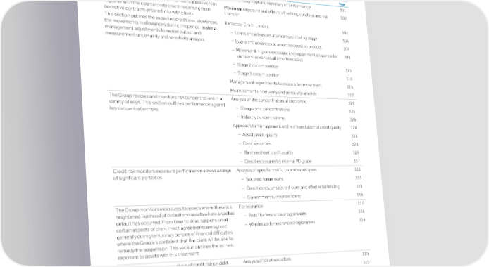 Strategic Shareholder Climate and Risk Financial Financial Barclays PLC 300 report information sustainability report Governance review review statements Annual Report 2022 Risk performance - Credit risk Credit risk Credit risk: summary of contents Page Credit risk represents a significant risk and mainly arises Credit risk overview and summary of performance 301 from exposure to wholesale and retail loans and advances Maximum exposure and effects of netting, collateral and risk 302 together with the counterparty credit risk arising from transfer derivative contracts entered into with clients. This section outlines the expected credit loss allowances, Expected Credit Losses 304 the movements in allowances during the period, material – Loans and advances at amortised cost by stage 304 management adjustments to model output and – Loans and advances at amortised cost by product 306 measurement uncertainty and sensitivity analysis. – Movement in gross exposure and impairment allowance for 308 loans and advances at amortised cost – Stage 2 decomposition 313 – Stage 3 decomposition 314 Management adjustments to models for impairment 315 Measurement uncertainty and sensitivity analysis 317 The Group reviews and monitors risk concentrations in a Analysis of the concentration of credit risk 326 variety of ways. This section outlines performance against – Geographic concentrations 326 key concentration risks. – Industry concentrations 326 Approach to management and representation of credit quality 328 – Asset credit quality 328 – Debt securities 328 – Balance sheet credit quality 329 – Credit exposures by internal PD grade 331 Credit risk monitors exposure performance across a range Analysis of specific portfolios and asset types 333 of significant portfolios. – Secured home loans 333 – Credit cards, unsecured loans and other retail lending 335 – Government supported loans 336 The Group monitors exposures to assets where there is a Forbearance 337 heightened likelihood of default and assets where an actual – Retail forbearance programmes 338 default has occurred. From time to time, suspension of – Wholesale forbearance programmes 339 certain aspects of client credit agreements are agreed, generally during temporary periods of financial difficulties where the Group is confident that the client will be able to remedy the suspension. This section outlines the current exposure to assets with this treatment. This section provides an analysis of credit risk on debt Analysis of debt securities 339 securities and derivatives. Analysis of derivatives 340
