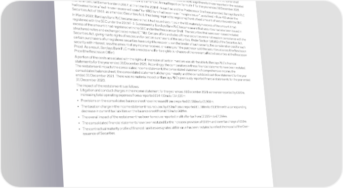 Strategic Shareholder Climate and Risk Financial Financial Barclays PLC 428 report information sustainability report Governance review review statements Annual Report 2022 Notes to the financial statements (continued) For the year ended 31 December 2022 1a Restatement of financial statements The comparatives in these consolidated financial statements for the year ended 31 December 2022 (the financial statements) have been restated to reflect both a provision and contingent liability disclosure in respect of the impact of an over-issuance of securities (the Over-issuance of Securities) in excess of the maximum aggregate offering price registered under Barclays Bank PLC’s shelf registration statement on Form F-3, as declared effective by the SEC in August 2019 (2019 F-3) and Barclays Bank PLC’s prior shelf registration statement (Predecessor Shelf). The comparatives have been restated so as to align them to those reported in the restated 2021 financial statements included in the Company’s amended Annual Report on Form 20-F for the year ended 31 December 2021. Due to an SEC settlement order in 2017, at the time the 2019 F-3 was filed and the Predecessor Shelf was amended, Barclays Bank PLC had ceased to be a “well-known seasoned issuer” (or WKSI) and had become an “ineligible issuer”, as defined in Rule 405 under the Securities Act of 1933, as amended (Securities Act), thus being required to register upfront a fixed amount of securities with the SEC. In March 2022, Barclays Bank PLC became aware that it had issued securities in the US materially in excess of the amount it had registered with the SEC under the 2019 F-3. Subsequently, Barclays Bank PLC became aware that securities had also been issued in excess of the amount it had registered with the SEC under the Predecessor Shelf. The securities that were over-issued included structured notes and exchange traded notes (ETNs). Certain offers and sales of these securities were not made in compliance with the Securities Act, giving rise to rights of rescission for certain purchasers of the securities. Under Section 12(a)(1) of the Securities Act, certain purchasers of unregistered securities have a right to recover, upon the tender of such security, the consideration paid for such security with interest, less the amount of any income received, or damages if the purchaser sold the securities at a loss (the Rescission Price). As a result, Barclays Bank PLC made a rescission offer to eligible purchasers of the relevant affected securities at the Rescission Price (the Rescission Offer). A portion of the costs associated with the rights of rescission of certain investors was attributable to Barclays PLC’s financial statements for the year ended 31 December 2021. Accordingly, the comparatives in these financial statements have been restated. The restatement impacts the consolidated income statement, the consolidated statement of comprehensive income, the consolidated balance sheet, the consolidated statement of changes in equity, and the consolidated cash flow statement for the year ended 31 December 2021. There was no material impact on Barclays PLC’s previously reported financial statements for the year ended 31 December 2020. The impact of the restatement is as follows: • Litigation and conduct charges in the income statement for the year ended 31 December 2021 were underreported by £220m, increasing total operating expenses from a reported £14,439m to £14,659m. • Provisions on the consolidated balance sheet have increased from a reported £1,688m to £1,908m. • The taxation charge in the income statement has reduced by £50m from a reported £1,188m to £1,138m with a corresponding decrease in current tax liabilities on the balance sheet from £739m to £689m. • The overall impact of the restatement has been to reduce reported profit after tax from £7,226m to £7,056m. • The consolidated financial statements have been restated for the increased provision of £220m and lower tax charge of £50m. • The contractual maturity profile of financial liabilities designated at fair value has been restated to reflect the impact of the Over- issuance of Securities.