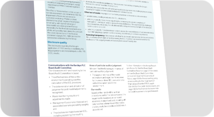 Strategic Shareholder Climate and Risk Financial Financial Barclays PLC 404 report information sustainability report Governance review review statements Annual Report 2022 KPMG LLP’s independent auditor’s report to the members of Barclays PLC (continued) Description of the Key Audit Matter Our response to the risk Our economics expertise: We involved our own economic specialists who assisted us in: ▪ Qualitative adjustments – Adjustments to the model-driven ECL results are raised by • assessing the reasonableness of the Group’s methodology and models for determining the management to address known impairment economic scenarios used and the probability weightings applied to them; model limitations or emerging trends as well • assessing key economic variables which included comparing samples of economic variables to as risks not captured by models. They external sources; represent approximately 8.5% of the ECL. These adjustments are inherently uncertain • assessing the overall reasonableness of the economic forecasts by comparing the Group’s and significant management judgement is forecasts to our own modelled forecasts; and involved in estimating certain post model • assessing the reasonableness of the Group’s qualitative adjustments by challenging key economic adjustments (“PMA’s”) and management assumptions applied in their calculation based on external sources. overlays. Other test of details: Key aspects of our testing in addition to those set out above involved: The effect of these matters is that, as part of our risk assessment, we determined that the • sample testing over key inputs into the ECL calculations; impairment of loans and advances to • selecting a sample of post model adjustments, considering the size and complexity of customers including off balance sheet management overlays, in order to assess the reasonableness of the adjustments by challenging elements has a high degree of estimation key assumptions, inspecting the calculation methodology and tracing a sample of the data used uncertainty, with a potential range of back to source data; and reasonable outcomes greater than our • selecting a sample of credit reviews in order to assess the reasonableness of customer risk ratings materiality for the financial statements as a by challenging key judgements and considering disconfirming or contradictory evidence. whole, and possibly many times that amount. The credit risk sections of the financial Assessing transparency: We assessed whether the disclosures appropriately disclose and address statements (pages 301-340) disclose the the uncertainty which exists when determining the ECL. In addition, we assessed whether the sensitivities estimated by the Group. disclosure of the key judgements and assumptions was sufficiently clear. Disclosure quality The disclosures regarding the Group’s application of IFRS 9 are key to explaining the key judgements and material inputs to the IFRS 9 ECL results. Communications with the Barclays PLC Areas of particular auditor judgement Further information in the Annual Report Board Audit Committee and Accounts: See the Board Audit We identified the following as the areas of Our discussions with and reporting to the Committee Report on page 173 for details particular auditor judgement: Board Audit Committee included: on how the Board Audit Committee • The appropriateness of the model considered impairment as an area of • The effectiveness of the control estimations and adjustments recorded focus, page 425 for the accounting policy environment operating over the to the model driven ECL calculations to on accounting for the impairment of calculation of the ECL provisions; reflect the current economic financial assets under IFRS 9, pages • The determination and utilisation of environment. 300-340 for the credit risk disclosures, and judgemental post model adjustments Our results page 436 for the financial disclosure note recognised; Based on the risk identified and our 8; Credit Impairment charges/(releases). • Model monitoring results and procedures performed we considered the adjustments made; impairment allowances on loans and • Management’s economic forecast and advances at amortised cost, including off- associated scenario probability weights; balance sheet elements and the related and disclosures to be acceptable (2021 result: acceptable). • The disclosures made to explain ECL, including explaining the resulting estimation uncertainty.