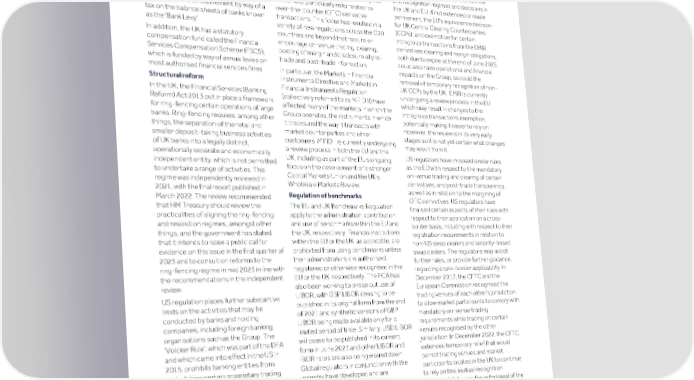 Strategic Shareholder Climate and Risk Financial Financial Barclays PLC 374 report information sustainability report Governance review review statements Annual Report 2022 Supervision and regulation (continued) Bank Levy and FSCS Market infrastructure regulation of market participants with effect from 2022. Access to the clearing services of The BRRD established a requirement for In recent years, regulators as well as certain Central Clearing Counterparties EU member states to set up a pre-funded global-standard setting bodies such as the (CCPs) used by Group entities is currently resolution financing arrangement with International Organisation of Securities permitted under temporary equivalence funding equal to 1% of covered deposits Commissions (IOSCO) have focused on and recognition regimes and decisions in by 31 December 2024 to cover the costs improving transparency and reducing risk the UK and EU. If not extended or made of bank resolutions. The UK has in markets, particularly risks related to permanent, the EU’s equivalence decision implemented this requirement by way of a over-the-counter (OTC) derivative for UK Central Clearing Counterparties tax on the balance sheets of banks known transactions. This focus has resulted in a (CCPs), and exemption for certain as the ‘Bank Levy’. variety of new regulations across the G20 intragroup transactions from the EMIR countries and beyond that require or In addition, the UK has a statutory derivatives clearing and margin obligations, encourage on-venue trading, clearing, compensation fund called the Financial both due to expire at the end of June 2025, posting of margin and disclosure of pre- Services Compensation Scheme (FSCS), could also have operational and financial trade and post-trade information. which is funded by way of annual levies on impacts on the Group, as could the most authorised financial services firms. In particular, the Markets in Financial removal of temporary recognition of non- Instruments Directive and Markets in Structural reform UK CCPs by the UK. EMIR is currently Financial Instruments Regulation In the UK, the Financial Services (Banking undergoing a review process in the EU (collectively referred to as MiFID II) have Reform) Act 2013 put in place a framework which may result in changes to the affected many of the markets in which the for ring-fencing certain operations of large intragroup transactions exemption, Group operates, the instruments in which banks. Ring-fencing requires, among other potentially making it easier to rely on. it trades and the way it transacts with things, the separation of the retail and However, the review is in its very early market counterparties and other smaller deposit-taking business activities stages so it is not yet certain what changes customers. MiFID II is currently undergoing of UK banks into a legally distinct, may result from it. a review process in both the EU and the operationally separate and economically US regulators have imposed similar rules UK, including as part of the EU’s ongoing independent entity, which is not permitted as the EU with respect to the mandatory focus on the development of a stronger to undertake a range of activities. This on-venue trading and clearing of certain Capital Markets Union and the UK’s regime was independently reviewed in derivatives, and post-trade transparency, Wholesale Markets Review. 2021, with the final report published in as well as in relation to the margining of Regulation of benchmarks March 2022. The review recommended OTC derivatives. US regulators have that HM Treasury should review the The EU and UK Benchmarks Regulation finalised certain aspects of their rules with practicalities of aligning the ring-fencing apply to the administration, contribution respect to their application on a cross- and resolution regimes, amongst other and use of benchmarks within the EU and border basis, including with respect to their things, and the government has stated the UK, respectively. Financial institutions registration requirements in relation to within the EU or the UK, as applicable, are that it intends to issue a public call for non-US swap dealers and security-based evidence on this issue in the first quarter of prohibited from using benchmarks unless swap dealers. The regulators may adopt 2023 and to consult on reforms to the their administrators are authorised, further rules, or provide further guidance, ring-fencing regime in mid 2023 in line with registered or otherwise recognised in the regarding cross-border applicability. In the recommendations in the independent EU or the UK, respectively. The FCA has December 2017, the CFTC and the also been working to phase out use of review. European Commission recognised the LIBOR, with GBP LIBOR ceasing to be US regulation places further substantive trading venues of each other’s jurisdiction published in its original form from the end limits on the activities that may be to allow market participants to comply with of 2021 and synthetic versions of GBP conducted by banks and holding mandatory on-venue trading LIBOR being made available only for a companies, including foreign banking requirements while trading on certain limited period of time. Similarly, USD LIBOR organisations such as the Group. The venues recognised by the other will cease to be published in its current ‘Volcker Rule’, which was part of the DFA jurisdiction. In December 2022, the CFTC form in June 2023 and other LIBOR and and which came into effect in the US in extended temporary relief that would IBOR rates are also being wound down. 2015, prohibits banking entities from permit trading venues and market Global regulators in conjunction with the undertaking certain proprietary trading participants located in the UK to continue industry have developed and are activities and limits such entities’ ability to to rely on this mutual recognition continuing to develop alternative sponsor or invest in ce