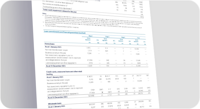 Strategic Shareholder Climate and Risk Financial Financial Barclays PLC 312 report information sustainability report Governance review review statements Annual Report 2022 Risk performance - Credit risk (continued) Reconciliation of ECL movement to credit impairment charge/(release) for the period Stage 1 Stage 2 Stage 3 Total £m £m £m £m Home loans (14) (25) (3) (42) Credit cards, unsecured loans and other retail lending 144 (1,068) 908 (16) Wholesale loans 58 (450) (34) (426) ECL movement excluding assets derecognised due to disposals and write-offs 188 (1,543) 871 (484) ECL movement on loan commitments and financial guarantees (39) (456) (27) (522) a ECL movement on other financial assets (5) (8) (2) (15) b Recoveries and reimbursements 59 224 (43) 240 c Total exchange and other adjustments 128 Total credit impairment release for the year (653) Notes a Other financial assets subject to impairment not included in the table above include cash collateral and settlement balances, financial assets at fair value through other comprehensive income and other assets. These have a total gross exposure of £155.2bn (December 2020: £180.3bn) and impairment allowance of £114m (December 2020: £165m). This comprises £6m ECL (December 2020: £11m) on £154.9bn Stage 1 assets (December 2020: £175.7bn), £1m (December 2020: £9m) on £157mn Stage 2 fair value through other comprehensive income assets, cash collateral and settlement assets (December 2020: £4.4bn) and £107m (December 2020: £145m) on £110m Stage 3 other assets (December 2020: £154m). b Recoveries and reimbursements includes a net reduction in amounts recoverable from financial guarantee contracts held with third parties of £306m and cash recoveries of previously written off amounts of £66m. c Includes foreign exchange and interest and fees in suspense. Loan commitments and financial guarantees (audited) Stage 1 Stage 2 Stage 3 Total Gross Gross Gross Gross exposure ECL exposure ECL exposure ECL exposure ECL £m £m £m £m £m £m £m £m Home loans As at 1 January 2021 11,861 — 516 — 5 — 12,382 — Net transfers between stages (131) — 124 — 7 — — — Business activity in the year 7,034 — — — — — 7,034 — Net drawdowns, repayments, net re- measurement and movement due to exposure and risk parameter changes (7,556) — (64) — (4) — (7,624) — Limit management and final repayments (375) — (44) — (5) — (424) — As at 31 December 2021 10,833 — 532 — 3 — 11,368 — Credit cards, unsecured loans and other retail lending As at 1 January 2021 114,371 55 12,117 305 229 23 126,717 383 Net transfers between stages 5,769 206 (6,379) (213) 610 7 — — Business activity in the year 11,206 — 430 — 2 — 11,638 — Net drawdowns, repayments, net re- measurement and movement due to exposure and risk parameter changes (742) (207) 217 (24) (526) (10) (1,051) (241) Limit management and final repayments (7,785) (4) (667) (7) (97) 0 (8,549) (11) As at 31 December 2021 122,819 50 5,718 61 218 20 128,755 131 Wholesale loans As at 1 January 2021 163,707 201 40,258 453 2,096 27 206,061 681 Net transfers between stages 8,227 221 (7,174) (215) (1,053) (6) — — Business activity in the year 44,085 14 4,658 102 10 — 48,753 116 Net drawdowns, repayments, net re- measurement and movement due to exposure and risk parameter changes 8,819 (229) (151) 7 515 (11) 9,183 (233) Limit management and final repayments (46,348) (40) (9,026) (106) (491) (7) (55,865) (153) As at 31 December 2021 178,490 167 28,565 241 1,077 3 208,132 411