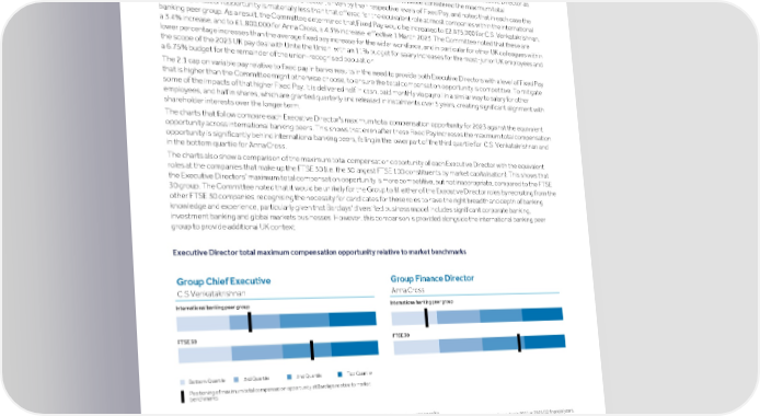 Strategic Shareholder Climate and Risk Financial Financial Barclays PLC 232 report information sustainability report Governance review review statements Annual Report 2022 Remuneration report (continued) The Committee determined the level of Fixed Pay for Anna Cross on appointment as Group Finance Director as £1,725,000 per annum. In doing so, they concluded that the total compensation opportunity that this provides was an appropriate starting point, while noting that it was low compared with international banking peers and that this should be kept under review each year. An annual review of the Executive Directors' Fixed Pay, in the same way and at the same time as for the wider workforce, is a feature of the DRP approved by shareholders in 2020. In February 2023, the Committee reviewed the Fixed Pay for each Executive Director as part of the year-end pay review process for colleagues across the Group. The Committee considered the maximum total compensation opportunity of each Executive Director, driven by their respective levels of Fixed Pay, and noted that in each case the total compensation opportunity is materially less than that offered for the equivalent role at most companies within the international banking peer group. As a result, the Committee determined that Fixed Pay would be increased to £2,875,000 for C.S. Venkatakrishnan, a 3.4% increase, and to £1,800,000 for Anna Cross, a 4.3% increase, effective 1 March 2023. The Committee noted that these are lower percentage increases than the average fixed pay increase for the wider workforce, and in particular for other UK colleagues within the scope of the 2023 UK pay deal with Unite the Union, with an 11% budget for salary increases for the most-junior UK employees and a 6.75% budget for the remainder of the union-recognised population. The 2:1 cap on variable pay relative to fixed pay in banks results in the need to provide both Executive Directors with a level of Fixed Pay that is higher than the Committee might otherwise choose, to ensure the total compensation opportunity is competitive. To mitigate some of the impacts of that higher Fixed Pay, it is delivered half in cash, paid monthly via payroll in a similar way to salary for other employees, and half in shares, which are granted quarterly and released in instalments over 5 years, creating significant alignment with shareholder interests over the longer term. The charts that follow compare each Executive Director's maximum total compensation opportunity for 2023 against the equivalent opportunity across international banking peers. This shows that even after these Fixed Pay increases the maximum total compensation opportunity is significantly behind international banking peers, falling in the lower part of the third quartile for C.S. Venkatakrishnan and in the bottom quartile for Anna Cross. The charts also show a comparison of the maximum total compensation opportunity of each Executive Director with the equivalent roles at the companies that make up the FTSE 30 (i.e. the 30 largest FTSE 100 constituents by market capitalisation). This shows that the Executive Directors’ maximum total compensation opportunity is more competitive, but not inappropriate, compared to the FTSE 30 group. The Committee noted that it would be unlikely for the Group to fill either of the Executive Director roles by recruiting from the other FTSE 30 companies, recognising the necessity for candidates for these roles to have the right breadth and depth of banking knowledge and experience, particularly given that Barclays’ diversified business model includes significant corporate banking, investment banking and global markets businesses. However, this comparison is provided alongside the international banking peer group to provide additional UK context. Executive Director total maximum compensation opportunity relative to market benchmarks Group Chief Executive Group Finance Director C.S Venkatakrishnan Anna Cross International banking peer group International banking peer group FTSE 30 FTSE 30 Bottom Quartile 3rd Quartile 2nd Quartile Top Quartile n n n n Positioning of maximum total compensation opportunity at Barclays relative to market benchmarks Notes: • Barclays and market benchmark data reflects maximum total compensation opportunity, excluding pensions and benefits. • Benchmark data for the international banking peer group and FTSE 30 was provided by Willis Towers Watson, based on publicly disclosed data in respect of each firm's 2021 or 2021/22 financial years, incorporating assumptions where companies do not disclose a maximum total compensation opportunity. • Barclays’ current peer group comprises the following international banks: Bank of America, BNP Paribas, Citigroup, Credit Suisse Group, Deutsche Bank, Goldman Sachs, HSBC Holdings, JP Morgan Chase & Co, Lloyds Banking Group, Morgan Stanley, Standard Chartered and UBS Group. The Committee added Goldman Sachs to the peer group during 2022.