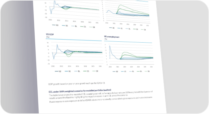 Strategic Shareholder Climate and Risk Financial Financial Barclays PLC 322 report information sustainability report Governance review review statements Annual Report 2022 Risk performance - Credit risk (continued) The graphs below plot the historical data for GDP growth rate and unemployment rate in the UK and US as well as the forecasted data under each of the five scenarios. UK unemployment UK GDP (%) (%) 10 30 9 20 8 7 10 6 5 0 4 -10 3 2 -20 1 0 -30 2020 2022 2024 2026 2028 2030 2032 2020 2022 2024 2026 2028 2030 2032 U2 U1 BL D1 D2 U2 U1 BL D1 D2 US unemployment US GDP (%) (%) 15 14 12 10 10 5 8 0 6 -5 4 -10 2 -15 0 2020 2022 2024 2026 2028 2030 2032 2020 2022 2024 2026 2028 2030 2032 U2 U1 BL D1 D2 U2 U1 BL D1 D2 GDP growth based on year on year growth each quarter (Q/(Q-4)). ECL under 100% weighted scenarios for modelled portfolios (audited) The table below shows the modelled ECL assuming each of the five modelled scenarios are 100% weighted with the dispersion of results around the Baseline, highlighting the impact on exposure and ECL across the scenarios. Model exposure uses exposure at default (EAD) values and is not directly comparable to gross exposure used in prior disclosures.