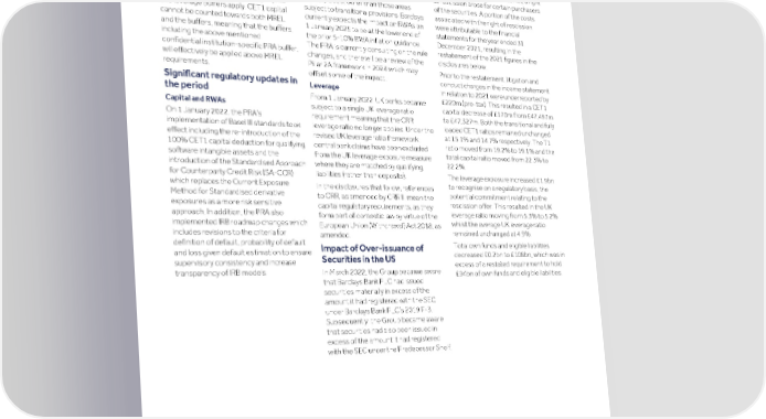Strategic Shareholder Climate and Risk Financial Financial Barclays PLC 356 report information sustainability report Governance review review statements Annual Report 2022 Risk performance - Treasury and Capital risk (continued) On 30 November 2022, the PRA published The securities issued in excess of the Minimum requirements for own its consultation paper 'Implementation of registered amount included structured funds and eligible liabilities the Basel 3.1 standards', which covers the products and exchange traded notes. As The Group is required to meet the higher remaining parts of the Basel III standards these securities were not issued in of: (i) two times the sum of 8% Pillar 1 and to be implemented in the UK. Changes are compliance with the Securities Act, a right 4.3% Pillar 2A equating to 24.5% of RWAs; expected to come in to force from 1 of rescission arose for certain purchasers and (ii) 6.75% of leverage exposures. In January 2025, other than those areas of the securities. A portion of the costs addition, the higher of regulatory capital associated with the right of rescission subject to transitional provisions. Barclays and leverage buffers apply. CET1 capital currently expects the impact on RWAs on were attributable to the financial cannot be counted towards both MREL 1 January 2025 to be at the lower end of statements for the year ended 31 and the buffers, meaning that the buffers, the prior 5-10% RWA inflation guidance. December 2021, resulting in the including the above mentioned The PRA is currently consulting on the rule restatement of the 2021 figures in the confidential institution-specific PRA buffer, disclosures below. changes, and there will be a review of the will effectively be applied above MREL Pillar 2A framework in 2024 which may Prior to the restatement, litigation and requirements. offset some of the impact. conduct charges in the income statement Significant regulatory updates in Leverage in relation to 2021 were underreported by the period £220m (pre-tax). This resulted in a CET1 From 1 January 2022, UK banks became capital decrease of £170m from £47,497m Capital and RWAs subject to a single UK leverage ratio to £47,327m. Both the transitional and fully requirement meaning that the CRR On 1 January 2022, the PRA’s loaded CET1 ratios remained unchanged leverage ratio no longer applies. Under the implementation of Basel III standards took at 15.1% and 14.7% respectively. The T1 revised UK leverage ratio framework, effect including the re-introduction of the ratio moved from 19.2% to 19.1% and the central bank claims have been excluded 100% CET1 capital deduction for qualifying total capital ratio moved from 22.3% to from the UK leverage exposure measure software intangible assets and the 22.2%. where they are matched by qualifying introduction of the Standardised Approach liabilities (rather than deposits). for Counterparty Credit Risk (SA-CCR) The leverage exposure increased £1.9bn which replaces the Current Exposure to recognise on a regulatory basis, the In the disclosures that follow, references Method for Standardised derivative potential commitment relating to the to CRR, as amended by CRR II, mean the exposures as a more risk sensitive rescission offer. This resulted in the UK capital regulatory requirements, as they approach. In addition, the PRA also leverage ratio moving from 5.3% to 5.2% form part of domestic law by virtue of the implemented IRB roadmap changes which whilst the average UK leverage ratio European Union (Withdrawal) Act 2018, as includes revisions to the criteria for remained unchanged at 4.9%. amended. definition of default, probability of default Total own funds and eligible liabilities Impact of Over-issuance of and loss given default estimation to ensure decreased £0.2bn to £108bn, which was in Securities in the US supervisory consistency and increase excess of a restated requirement to hold transparency of IRB models. In March 2022, the Group became aware £94bn of own funds and eligible liabilities. that Barclays Bank PLC had issued securities materially in excess of the amount it had registered with the SEC under Barclays Bank PLC’s 2019 F-3. Subsequently, the Group became aware that securities had also been issued in excess of the amount it had registered with the SEC under the Predecessor Shelf.