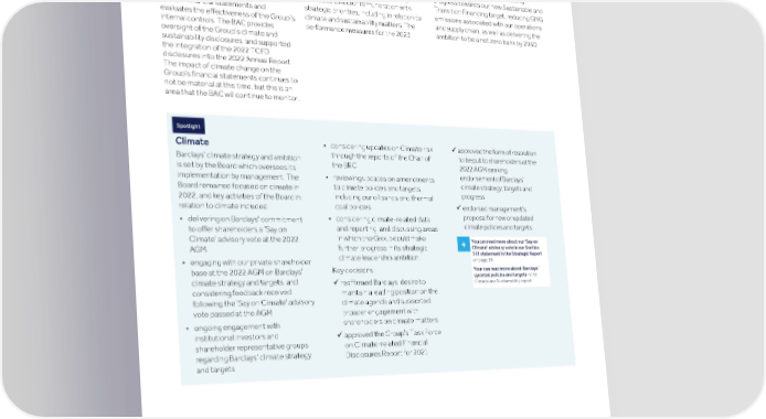 Strategic Shareholder Climate and Risk Financial Financial Barclays PLC 249 report information sustainability report Governance review review statements Annual Report 2022 ESG: Governance (continued) The BRC also reviewed the ERMF and Board Remuneration annual bonus and 2023-2025 Long Term Committee (RemCo) recommended the same to the Board for Incentive Plan (LTIP) for the Executive its approval, and reviewed each of the Directors both include a 'Climate and The RemCo is responsible for setting the Principal Risk frameworks, including the sustainability' category, focusing on overarching principles and parameters of Climate Risk Framework. climate-related measures including remuneration policy across the Group. The progress towards our new Sustainable and RemCo has responsibility for aligning Board Audit Committee (BAC) Transition Financing target, reducing GHG Executive Director remuneration with The BAC assesses the integrity of the emissions associated with our operations strategic priorities, including in relation to Group’s financial statements and and supply chain, as well as delivering the climate and sustainability matters. The evaluates the effectiveness of the Group’s ambition to be a net zero bank by 2050. performance measures for the 2023 internal controls. The BAC provides oversight of the Group’s climate and sustainability disclosures, and supported the integration of the 2022 TCFD disclosures into the 2022 Annual Report. The impact of climate change on the Group’s financial statements continues to not be material at this time, but this is an area that the BAC will continue to monitor. Spotlight • considering updates on Climate risk üapproved the form of resolution Climate through the reports of the Chair of to be put to shareholders at the Barclays’ climate strategy and ambition the BRC 2022 AGM seeking is set by the Board which oversees its endorsement of Barclays’ • reviewing updates on amendments implementation by management. The climate strategy, targets and to climate policies and targets, Board remained focused on climate in progress including our oil sands and thermal 2022, and key activities of the Board in coal policies üendorsed management’s relation to climate included: proposal for new or updated • considering climate-related data • delivering on Barclays' commitment climate policies and targets. and reporting, and discussing areas to offer shareholders a ‘Say on in which the Group could make Climate’ advisory vote at the 2022 You can read more about our 'Say on + Climate' advisory vote in our Section further progress in its strategic AGM 172 statement in the Strategic Report climate leadership ambition. on page 19. • engaging with our private shareholder Your can read more about Barclays’ Key decisions: base at the 2022 AGM on Barclays’ updated policies and targets in the climate strategy and targets, and Climate and Sustainability report. üreaffirmed Barclays’ desire to considering feedback received maintain a leading position on the following the 'Say on Climate' advisory climate agenda and supported vote passed at the AGM broader engagement with shareholders on climate matters • ongoing engagement with institutional investors and üapproved the Group’s Task Force shareholder representative groups on Climate-related Financial regarding Barclays’ climate strategy Disclosures Report for 2021 and targets