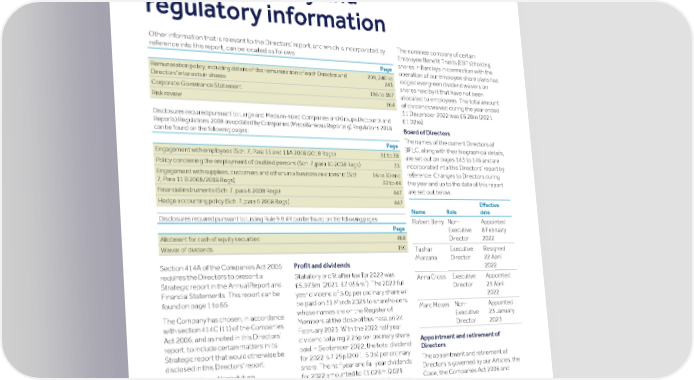 Strategic Shareholder Climate and Risk Financial Financial Barclays PLC 190 report information sustainability report Governance review review statements Annual Report 2022 Directors’ report: Other statutory and regulatory information The Directors present their report together with the audited accounts for the year ended 31 December 2022. Other statutory and regulatory information The nominee company of certain Other information that is relevant to the Directors’ report, and which is incorporated by Employee Benefit Trusts (EBTs) holding reference into this report, can be located as follows: shares in Barclays in connection with the Page operation of our employee share plans has Remuneration policy, including details of the remuneration of each Director and 209, 240 to lodged evergreen dividend waivers on 241 Directors’ interests in shares shares held by it that have not been Corporate Governance Statement 186 to 187 allocated to employees. The total amount Risk review 264 of dividends waived during the year ended 31 December 2022 was £6.28m (2021: Disclosures required pursuant to Large and Medium-sized Companies and Groups (Accounts and £1.02m). Reports) Regulations 2008 as updated by Companies (Miscellaneous Reporting) Regulations 2018 Board of Directors can be found on the following pages: The names of the current Directors of Page BPLC, along with their biographical details, Engagement with employees (Sch. 7, Para 11 and 11A 2008/2018 Regs) 31 to 38 are set out on pages 143 to 146 and are Policy concerning the employment of disabled persons (Sch. 7, para 10 2008 Regs) 33 incorporated into this Directors’ report by reference. Changes to Directors during Engagement with suppliers, customers and others in a business relationship (Sch. 16 to 30 and 7, Para 11 B 2008/2018 Regs) 39 to 44 the year and up to the date of this report are set out below. Financial instruments (Sch. 7, para 6 2008 Regs) 447 Hedge accounting policy (Sch. 7, para 6 2008 Regs) 447 Effective Name Role date Disclosures required pursuant to Listing Rule 9.8.4R can be found on the following pages: Robert Berry Non- Appointed Page Executive 8 February Allotment for cash of equity securities 488 Director 2022 Waiver of dividends 190 Tushar Executive Resigned Morzaria Director 22 April Profit and dividends Section 414A of the Companies Act 2006 2022 requires the Directors to present a Statutory profit after tax for 2022 was Anna Cross Executive Appointed 1 Strategic report in the Annual Report and £5,973m (2021: £7,056m ). The 2022 full Director 23 April Financial Statements. This report can be year dividend of 5.0p per ordinary share will 2022 found on page 1 to 65. be paid on 31 March 2023 to shareholders Marc Moses Non- Appointed whose names are on the Register of The Company has chosen, in accordance Executive 23 January Members at the close of business on 24 with section 414C (11) of the Companies Director 2023 February 2023. With the 2022 half year Act 2006, and as noted in this Directors’ dividend totalling 2.25p per ordinary share, report, to include certain matters in its Appointment and retirement of paid in September 2022, the total dividend Directors Strategic report that would otherwise be for 2022 is 7.25p (2021: 6.0p) per ordinary disclosed in this Directors’ report: The appointment and retirement of share. The half year and full year dividends Directors is governed by our Articles, the • an indication of likely future for 2022 amounted to £1,028m (2021: Code, the Companies Act 2006 and developments may be found in the £512m). BPLC also completed share buy- related legislation. Strategic report back programmes during 2022, further The Articles may be amended only by a • the particulars of important events details of which can be found on page 194. special resolution of the shareholders. The affecting the Company since the Shareholders may have their dividends Board has the power to appoint additional financial year end can be found in the reinvested in Barclays by joining the Directors or to fill a casual vacancy among Strategic report and Note 26 (Legal, Barclays DRIP. Further details regarding the Directors and any Director so competition and regulatory matters) to the DRIP can be found at home.barclays/ appointed holds office only until the next the financial statements. dividends and shareview.co.uk/info/drip. AGM and may offer themselves for re- Note election. The Code recommends that all 1 2021 financial and capital metrics have been restated to reflect the impact of the Over-issuance of Securities. See directors of FTSE 350 companies should Impact of the Over-issuance of Securities on page 356 and be subject to annual re-election. All Restatement of financial statements (Note 1a) on page 428 for further details Directors who will be continuing in office intend to offer themselves for election or re-election at the 2023 AGM save for Mike