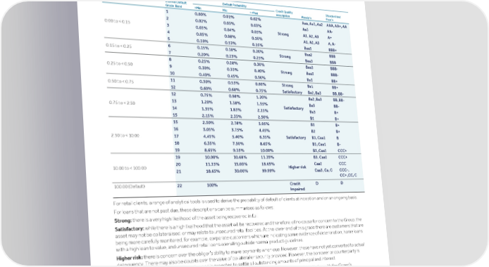 Strategic Shareholder Climate and Risk Financial Financial Barclays PLC 328 report information sustainability report Governance review review statements Annual Report 2022 Risk performance - Credit risk (continued) The approach to management and representation of credit quality Asset credit quality The credit quality distribution is based on the IFRS 9 12-month probability of default (PD) at the reporting date to ensure comparability with other ECL disclosures in the Expected Credit Losses section. The following internal measures are used to determine credit quality for loans: Default Probability Internal Default Credit Quality Standard and PD Range % Grade Band >Min Mid