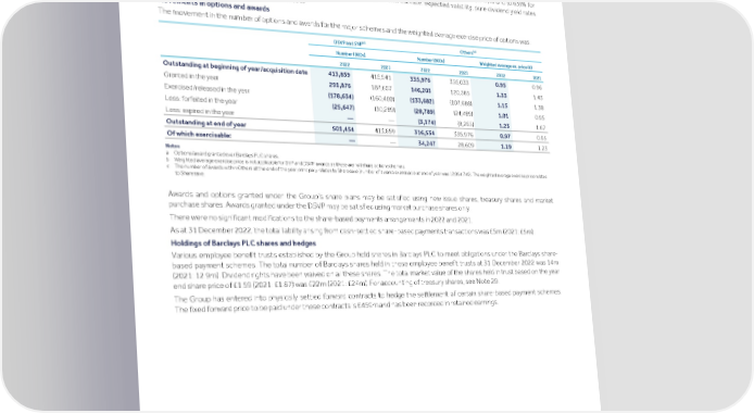 Strategic Shareholder Climate and Risk Financial Financial Barclays PLC 493 report information sustainability report Governance review review statements Annual Report 2022 Notes to the financial statements (continued) Employee benefits SVP and DSVP are nil cost awards on which the performance conditions are substantially completed at the date of grant. Consequently, the fair value of these awards is based on the market value at that date. Sharesave has a contractual life of 3 years and 5 years,the expected volatility is 31.10% for 3 years and 30.56% for 5 years. The risk free interest rates used for valuations are 4.28% and 4.05% for 3 years and 5 years respectively. The pure dividend yield rates used for valuations are 4.01% and 3.93% for 3 years and 5 years respectively. The repo rates used for valuations are (0.47)% and (0.63)% for 3 years and 5 years respectively. The inputs into the model such as risk free interest rate, expected volatility, pure dividend yield rates and repo rates are derived from the market data. Movements in options and awards The movement in the number of options and awards for the major schemes and the weighted average exercise price of options was: a,b a,c DSVP and SVP Others Number (000s) Number (000s) Weighted average ex. price (£) 2022 2021 2022 2021 2022 2021 Outstanding at beginning of year/acquisition date 413,859 416,941 335,976 356,033 0.95 0.96 Granted in the year 291,876 187,667 146,203 120,385 1.33 1.43 Exercised/released in the year (178,634) (160,460) (133,682) (107,688) 1.15 1.38 Less: forfeited in the year (25,647) (30,289) (28,789) (24,489) 1.01 0.95 Less: expired in the year — — (3,174) (8,265) 1.23 1.67 Outstanding at end of year 501,454 413,859 316,534 335,976 0.97 0.95 Of which exercisable: — — 34,247 28,609 1.19 1.23 Notes a Options/award granted over Barclays PLC shares. b Weighted average exercise price is not applicable for SVP and DSVP awards as these are not share option schemes. c The number of awards within Others at the end of the year principally relates to Sharesave (number of awards exercisable at end of year was 13,954,749). The weighted average exercise price relates to Sharesave. Awards and options granted under the Group’s share plans may be satisfied using new issue shares, treasury shares and market purchase shares. Awards granted under the DSVP may be satisfied using market purchase shares only. There were no significant modifications to the share-based payments arrangements in 2022 and 2021. As at 31 December 2022, the total liability arising from cash-settled share-based payments transactions was £5m (2021: £5m). Holdings of Barclays PLC shares and hedges Various employee benefit trusts established by the Group hold shares in Barclays PLC to meet obligations under the Barclays share- based payment schemes. The total number of Barclays shares held in these employee benefit trusts at 31 December 2022 was 14m (2021: 12.9m). Dividend rights have been waived on all these shares. The total market value of the shares held in trust based on the year end share price of £1.59 (2021: £1.87) was £22m (2021: £24m). For accounting of treasury shares, see Note 29. The Group has entered into physically settled forward contracts to hedge the settlement of certain share-based payment schemes. The fixed forward price to be paid under these contracts is £469m and has been recorded in retained earnings.