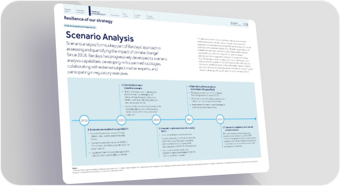 Strategic Shareholder Climate and Risk Financial Financial Barclays PLC 128 report information sustainability report Governance review review statements Annual Report 2022 Resilience of our strategy TCFD Strategy Recommendation (c) The outcomes, time horizon and future pathways for climate- related events and risks are highly uncertain, which presents challenges in understanding and quantifying the impact on financial Scenario Analysis systems and market participants. It is critical for organisations to evaluate the business implications of climate-related risks and Scenario analysis forms a key part of Barclays’ approach in opportunities to inform strategic thinking and to design 1 appropriate risk management strategies in response to these assessing and quantifying the impact of climate change . risks. At Barclays, scenario analysis and stress testing tools are Since 2018, Barclays has progressively developed its scenario used to provide insights on the effects of transition and physical risks on our portfolios under a range of climate change scenarios, analysis capabilities, developing-in house methodologies, which we intend to increasingly use to inform financial planning and business strategy setting, risk appetite and risk management. collaborating with external subject matter experts, and participating in regulatory exercises. 2. Internal short-term 4. Exploratory climate scenarios transition scenario by the Bank of England (BoE) • Short-term assessment exploring the • Barclays participated in the BoE’s Climate potential transition risk impact of a Biennial Exploratory Scenario (CBES) ‘Climate Minsky Moment’ with a rapid • Stress test covers three long-term scenarios: market correction, followed by broader Early Action, Late Action and No Action macroeconomic shocks • Assessments focused on credit risk impacts • Scenario narrative and shocks informed by to wholesale and retail portfolios external publications e.g. RA insurance climate stress, DNB energy transition stress test. 1. External case studies through UNEP FI 3. Internal climate scenarios informed by 5. Framework, regulatory and internal NGFS scenario analysis • Case study exercises covering Power Utilities, Oil & Gas and Residential Real • Long-term climate internal stress test This year, Barclays has participated in Estate regulatory stress tests (e.g. ECB CRST), • Scenario narrative and shocks informed by conducted bespoke internal scenario analysis • Scenario assessment based on REMIND NGFS ‘Disorderly Transition’ combined o exercises and further developed frameworks 2 C scenario, assessing a specific client set with internal scenario of comparable for performing scenario-based climate risk in each sector sensitivity (pre-COVID IFRS 9 Downside 1) measurement exercises • Judgement-led and simplistic approach to • Second assessment considered calculate climate probabilities of default incremental physical risk impact from the ‘Hot House World’ scenario Notes: 1 Informed by the Basel Committee on Banking Supervision's 2021 "Climate-related financial risks - measurement methodologies" report, Barclays considers climate scenario analysis as forward-looking projections of climate risk outcomes, with climate stress testing a subset of this where the exercise is designed to evaluate financial resiliency to a severe but plausible scenario.