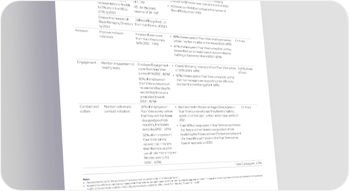 Strategic Shareholder Climate and Risk Financial Financial Barclays PLC 221 report information sustainability report Governance review review statements Annual Report 2022 Remuneration report (continued) Colleagues Measure Criteria Performance Commentary Outcome Diversity 33% females at 29% in 2022, increasing • Continued to make progress towards 2025 Gender On track Managing Director and from 28% in 2021 and Race at Work Ambitions Director level by 2025 • In the UK, females occupied 31% of Managing Increase under- UK: 4.6% (2020 baseline Director and Director level roles at the end of 2022 represented minority of 4.1%) • Achieved our Ambition to double the number of representation in the UK US: 20.3% (2020 Black MDs by end of 2022 a to 5% and in the US to baseline of 18.1%) 21% by 2025 Double the number of 18 Black MDs globally, up Black Managing Directors from 9 at the end of 2020 by 2022 Inclusion Improve inclusion Inclusion Index score • 88% of employees in ‘Your View’ employee survey On track indicators from Your View survey told us they feel included in their team (2021: 88%) 82% (2021: 79%) • 84% of employee in Your View survey told us they believe that senior leaders are truly committed to building a diverse workforce (2021: 82%) Engagement Maintain engagement at Employee Engagement • Overall Wellbeing Index score from Your View survey Slightly ahead of 86% (2021: 84%) of track healthy levels score from Your View b survey 84% (2021: 82%) • 90% of employees in Your View survey told us that 85% of employees in their line managers are supporting their efforts to Your View survey would maintain their wellbeing (2021: 88%) recommend Barclays to people they know as a great place to work (2021: 82%) Conduct and Maintain culture and 92% of employees in • Improvement in the percentage of employees in On track culture conduct indicators Your View survey believe Your View survey who said they feel it is “safe to that they and their team speak up at Barclays”, up four percentage points on do a good job of role 2021 modelling the Values • Over 90% of employees in Your View survey believe every day (2021: 92%) that they and their teams do a good job of role 92% of employees in modelling the Values and our Mindset every day and Your View survey the three Mindset Indices in the Your View survey believe that they and have all improved on 2021 their team do a good job of role modelling our Mindset every day (2021: 89%) Total Colleagues: 5.0% Notes a Represented to 1dp for the purposes of the assessment, rounded to 0dp in the Strategic Report. b As part of our efforts to improve our measurement frameworks, we have transitioned to a new 3 question engagement model. This was after collecting 4 years of concurrent data and running analysis to affirm the new model’s validity. Historic figures have been updated to reflect results from the new “3 question” model.