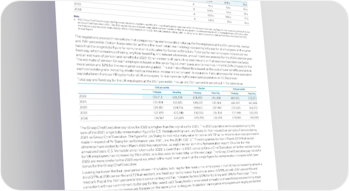Strategic Shareholder Climate and Risk Financial Financial Barclays PLC 237 report information sustainability report Governance review review statements Annual Report 2022 Remuneration report (continued) Group Chief Executive pay ratio The table below shows the ratios of the Group Chief Executive’s total remuneration to the total remuneration of UK employees since 2018 and the change in the pay ratios for 2022 is explained below. Option 25th percentile Median 75th percentile 2022 A 154 x 101 x 58 x a 2021 A 95 x 62 x 35 x 2020 A 144 x 95 x 53 x 2019 A 213 x 140 x 77 x 2018 A 126 x 85 x 45 x Note a 2021 Group Chief Executive pay ratio figures are calculated using the sum of the 2021 single total figure for remuneration for C.S. Venkatakrishnan and Jes Staley for their respective periods of service as Group Chief Executive in 2021. The 2021 pay ratio figures have been recalculated to reflect the reduction that will be applied to the deferred elements of C.S. Venkatakrishnan’s 2021 bonus, after the financial outcomes were recalculated to reflect the restatement of the 2021 financial statements, though after rounding the pay ratios shown are unchanged from those disclosed in the 2021 Annual Report. The regulations provide three options that companies may use to calculate total pay for the employees at the 25th percentile, median and 75th percentile. Option A was selected as this is the most robust methodology, calculating total pay for all employees on the same basis that the single total figure for remuneration is calculated for Executive Directors. Total pay for each employee includes earned fixed pay, which is made up of salary, any Role Based Pay and relevant allowances, annual incentives awarded for the 2022 calendar year, and an estimate of pension and benefits for 2022. Other elements of pay such as overtime and shift allowances have been excluded. The estimate of pension for each employee is based on the percentage currently available to new hires in the UK (10% of salary for the more senior and 12% for the more junior corporate grades). The estimate of benefits is based on the cost of core benefits available at each corporate grade, including private medical insurance, income protection and life assurance. Calculations use full-time equivalent pay data taken from our HR systems for all UK employees, for each year using the employee population on 31 December. Total pay and fixed pay for the UK employees at the 25th percentile, median and 75th percentile are set out in the table below. 25th percentile Median 75th percentile Total pay Fixed Pay Total pay Fixed Pay Total pay Fixed Pay 2022 £33,711 £28,300 £51,493 £41,608 £89,911 £71,071 2021 £31,404 £26,035 £48,253 £39,461 £85,407 £67,408 2020 £29,380 £24,706 £44,631 £37,460 £79,324 £64,272 2019 £27,875 £23,348 £42,362 £35,158 £77,488 £62,263 2018 £26,587 £21,899 £39,390 £32,202 £74,685 £60,000 The Group Chief Executive pay ratios for 2022 are higher than the pay ratios for 2021. The 2021 pay ratios were calculated using the sum of the 2021 single total remuneration figure for C.S. Venkatakrishnan and Jes Staley for their respective periods of service during 2021 as Group Chief Executive. The figure for Jes Staley did not include any value for bonus or LTIP as no remuneration decisions were made in respect of Mr Staley for performance-year 2021, and the 2019-2021 LTIP award granted to him in March 2019 that would otherwise have vested to him in March 2022 was suspended, as explained earlier in this Remuneration report. On a like-for-like annualized basis, C.S. Venkatakrishnan’s bonus for 2022 is lower than his 2021 bonus as Group Chief Executive, while the median bonus for UK employees has increased by 3% in 2022, as is discussed in more detail on the next page. The Group Chief Executive pay ratios for 2022 are more similar to the 2020 pay ratios, which is the most recent year that the single figure for remuneration included a full-year bonus for the Group Chief Executive. Looking back over the four-year period shown in the tables, total pay for the more junior employees in the UK has increased by almost a third (27% at 25th percentile and 31% at median), and fixed pay has increased by a similar amount (29% at both 25th percentile and median). Pay at the 75th percentile (more senior colleagues) has increased by less (20% for total pay and 18% for fixed pay). This is consistent with our commitment to fair pay for the lowest paid. Salary levels are reviewed annually to ensure these exceed living wage benchmarks and salary increases are focused on the more junior colleagues. In addition, more junior employees are largely protected from decreases in bonus pool. Barclays remuneration philosophy is set out earlier in this report, and all remuneration decisions for Executive Directors and the wider workforce are made within this framework. The Group Chief Executive pay ratio is one of the outcomes of all of these decisions, which are explained in more detail in the Committee Chair’s annual statement. To ensure that Executive Director remuneration outcomes are commensurate with experience for the wider workforce, the Remuneration Committee each year specifically considers whether the bonus and LTIP outcomes for the Executive Directors appropriately reflect the Group’s performance, shareholder experience and the remuneration outcomes for the wider workforce, as part of determining whether a discretionary adjustment should be made to the Executive Directors’ incentive outcomes. The Committee concluded that this remains the case for this year's remuneration outcomes.