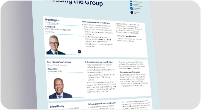 Strategic Shareholder Climate and Risk Financial Financial Barclays PLC 143 report information sustainability report Governance review review statements Annual Report 2022 Directors’ report: Our Board of Directors Board Committee membership Guided by our Purpose, Audit Committee Member Nominations Committee Member Values and Mindset Remuneration Committee Member Risk Committee in leading the Group Member Committee Chair Nigel spent 36 years at Rothschild & Co. Skills, experience and contribution: Nigel Higgins where he was most recently Deputy • seasoned business leader with extensive Group Chairman Chairman. Prior to that he was Chairman of experience in, and understanding of, the Group Executive Committee and Appointed: banking and the financial services industry Managing Partner of Rothschild & Co. March 2019 (Board), May 2019 • strong track record in leading and chairing (Chairman) organisations Key current appointments: • significant experience in providing Chairman, Sadler’s Wells; Non-Executive strategic advice to major international Director, Tetra Laval Group organisations and governments • keenly focused on culture and corporate governance. Before joining Barclays in 2016, Venkat Skills, experience and contribution: C.S. Venkatakrishnan worked at JPMorgan Chase from 1994, • highly regarded leader with significant Group Chief Executive holding senior roles in Asset Management, global banking experience Investment Banking, and in Risk. Appointed: • extensive background in financial markets November 2021 and risk management Key current appointments: • deep understanding of the business and Board Member, Institute of International the areas within which the Group Finance; Advisory member to the Board, operates. Massachusetts Institute of Technology Golub Centre for Finance and Policy; Prior to his appointment as Group Chief Member of the UN Environment Programme Executive, Venkat served as Head of Global Finance Initiative Leadership Council Markets and Co-President of Barclays Bank PLC from October 2020 and Group Chief Risk Officer from 2016 to 2020. His other senior-level experience includes Skills, experience and contribution: Brian Gilvary serving on the boards of various commercial • extensive senior level experience of Senior Independent Director (SID) and charitable organisations. Brian was Chair management, finance and strategy Appointed: of The 100 Group of FTSE 100 Finance • deep experience of US and UK February 2020 (Board), January 2021 (SID) Directors, a member of the UK Treasury shareholder engagement Financial Management Review Board and has • significant experience with, and served on various HRH Prince of Wales' understanding of, the challenges and Business in the Community Leadership opportunities inherent in advancing a Teams. sustainable energy future. Key current appointments: Brian spent much of his career with BP p.l.c. in senior leadership roles, where he was Non-Executive Chair, INEOS Energy, an most recently Chief Financial Officer. INEOS group company