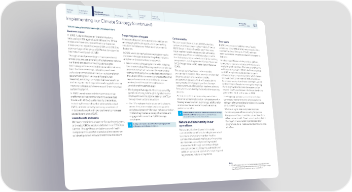 Strategic Shareholder Climate and Risk Financial Financial Barclays PLC 83 report information sustainability report Governance review review statements Annual Report 2022 Implementing our Climate Strategy (continued) TCFD Strategy Recommendation (b) | Strategic Pillar 1 Business travel Supporting our colleagues Carbon credits Zero waste In 2022, total colleague air travel emissions In support of our net zero operations ambition we We plan to purchase at least 42,000 voluntary In 2022, we produced 5,616 tonnes of waste a reduced by 73% against a 2018 baseline. While are engaging with colleagues and implementing carbon credits to remain carbon neutral for our across our sites, 69% of which was recycled. Due emissions have decreased from our baseline, initiatives to reduce our individual environmental 2022 Scope 1, Scope 2 and Scope 3 business to return to the office, post-COVID, we have emissions increased between 2021 and 2022 by footprints. travel market-based emissions. We will look to seen an increase in waste produced compared to a percentage difference of 24% due to return to purchase a portfolio of certified carbon credits last year. In 2022, we implemented several programmes to business travel post-COVID. that follow industry standards and GHG crediting increase colleague understanding of our net zero All sites in our UK real estate portfolio (offices, Though a small percentage of our operational programmes including Verified Carbon Standard ambition and opportunities to support it: branches, campuses and data centres) are zero emissions, we use a variety of solutions to reduce (VCS) Programme and Climate Action Reserve waste to landfill certified. We have an ambition to • We provided colleague green benefits including our travel emissions including using digital (CAR). achieve and maintain TRUE (Total Resource Use the relaunch of our UK salary sacrifice car scheme technology where practicable as an alternative to We periodically review our carbon credits and Efficiency) zero waste certified projects as an electric vehicle scheme. We have worked face-to-face meetings, adjusting our travel procurement process. We currently conduct due across our key campuses by 2035, which means with our third party discounts platform provider in policy to promote lower carbon solutions (such diligence as part of our carbon credits we must divert a minimum of 90% of solid, non- the UK and US to curate and promote offers that as promoting train versus air travel when procurement process, that will include a third hazardous wastes from the environment, landfill support a more sustainable lifestyle, and are feasible), avoiding non-essential business trips party review of the project portfolio from an and incineration (waste-to-energy) to recycling seeking to roll this platform out to more and using our booking and reporting platforms to independent voluntary carbon markets advisory facilities or locations where the waste can be jurisdictions throughout 2023 improve colleagues’ awareness of their individual firm which is not directly involved in the sourcing reused. Our Pune campus in India was the first to • We deployed Barclays Go Green sustainability carbon footprint. process. achieve the TRUE certification in 2022. gamification programme globally, which led to In 2022, we also completed a review of our All final projects must pass independent due To deliver our ambition across the rest of our employees avoiding approximately 139tCO e 2 preferred airline partners and have selected diligence screening based on risk assessment in campuses, we are removing single use items, through their sustainable actions those with strong sustainability credentials, five key areas: location, technology, additionality, using on-site composters to reduce food waste • Our 12 employee-led environment networks including the use of sustainable aviation fuel environmental and social impacts as well as and promoting recycling. across the globe created and participated in (SAF), and are actively pursuing a number of potential benefits. We are using on-site composters across activities aligned with Barclays’ net zero ambition. initiatives to work with our partners to increase numerous global offices including Singapore, Further details on our carbon credits can be found on Barclays In 2022 they hosted a variety of activities and capacity and use of SAF. + ESG Data Centre at: home.barclays/sustainability/esg- Glasgow, and Pune. In addition, at our New York engaged with more than 6,200 Barclays resource-hub/reporting-and-disclosures/ Leased assets and waste offices we work with Goodr, which participated in employees We have established a baseline for our leased assets Barclays' Unreasonable Impact accelerator Nature and biodiversity in our Further information about how Barclays engages with and waste GHG emissions detailed in our ESG Data programme, to re-route our surplus food to local + colleagues can be found on page 118. operations Centre. Though these emissions are minimal in charities. Nature and biodiversity are intrinsically comparison to all other operational emissions, we connected to our efforts to mitigate and adapt will develop activities to address those emissions. to climate change and maintain healthy communities. As such, we focus on improving our resource use and protecting natural environments through our circular design principles including designing out waste and pollution across our operations, recycling, and regenerating natural ecosystems. Note a We define carbon neutral as first reducing carbon dioxide emissions then counterbalancing carbon dioxide emissions from Scope 1, Scope 2 and Scope 3 business travel with carbon credit offsets.
