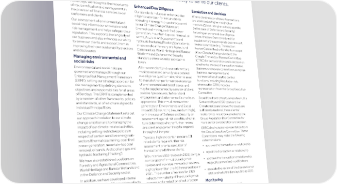 Strategic Shareholder Climate and Risk Financial Financial Barclays PLC 253 report information sustainability report Governance review review statements Annual Report 2022 ESG: Governance (continued) Managing impacts in lending and financing Appropriate management of environmental and social impacts helps to ensure the longevity of our business and our ability to serve our clients. At Barclays, we recognise the importance Enhanced Due Diligence Escalation and decision of risk identification and management in Our standards include an enhanced due Where client relationships or transactions the provision of financial services to our diligence approach for certain clients are assessed as higher-risk (high or customers and clients. operating in energy sub-sectors covered medium ESI risk rating) or outside appetite Our assessment of environmental and by our Climate Change Statement (in the case of Defence and Security) social risks informs our wholesale credit (thermal coal mining, coal-fired power following an enhanced due diligence risk management and helps safeguard our generation, mountain-top coal removal, oil review, they are then considered for reputation. This supports the longevity of sands, Arctic oil and gas projects and escalation to the appropriate business unit our business and also enhances our ability hydraulic fracturing ('fracking')) and clients review committee (e.g. Transaction to serve our clients and support them in in-scope of our Forestry and Agricultural Review Committee) or for clients in scope improving their own sustainability practices Commodities, World Heritage and Ramsar of our Climate Change standard, the and disclosures. Wetlands and Defence and Security Climate Transaction Review Committee standards where a similar approach is (CTRC) for consideration and a decision on Managing environmental and whether to proceed if transaction related. taken. social risks Business unit review committees comprise All in-scope clients in these sub-sectors Environmental and social risks are Business management and must be assessed annually via a detailed governed and managed through our representatives from the control due diligence questionnaire, which is used Enterprise Risk Management Framework functions, including Reputation risk, to evaluate their performance on a range (ERMF), setting our strategic approach for whereas the CTRC includes of environmental and social issues, and risk management by defining standards, representation from the Group Executive may be supplemented by a review of client objectives and responsibilities for all areas Committee. policies / procedures, further client of Barclays. The ERMF is complemented engagement and adverse media checks as Should the front office business team, the by a number of other frameworks, policies appropriate. This annual review either Sustainability and ESG team and / or and standards, all of which are aligned to Climate risk team believe the issues are generates an Environmental and Social individual Principal Risks. Impact (ESI) risk rating (low, medium, high), sufficiently material, these clients/ Our Climate Change Statement sets out or in the case of Defence and Security an relationships would be escalated to the our approach in relation to our climate assessment against risk appetite, which in Group Reputation Risk Committee for change ambition and to managing the turn determines whether further review more senior consideration and decision. impact of our climate-related activities, and client engagement may be required GRRC also includes representation from including setting restrictive policies in throughout the year. the Group Executive Committee. These respect of certain sensitive energy sub- Typically, high and certain medium ESI Committees may make the following sectors (thermal coal mining, coal-fired rated clients require further risk determinations: power generation, mountain-top coal assessment prior to execution of • approve the transaction or relationship removal, oil sands, Arctic oil and gas and transactions with those clients. hydraulic fracturing ('fracking'). • reject the transaction or relationship We undertook 869 reviews in 2022, being a We have also established positions on combination of annual due diligence • approve the transaction or relationship, Forestry and Agricultural Commodities, reviews and individual transaction reviews, subject to prescribed modifications World Heritage and Ramsar Wetlands and slightly fewer than the 903 we undertook in in the Defence and Security sector. • escalate the review of the transaction or 2021. The number of reviews for 2022 relationship to the Barclays Group CEO. In addition, we have developed internal reflects the maturity of the due diligence standards for each of these which reflects process and a reduction of out of scope Monitoring these positions in more detail. These referrals. As part of our management of standards, which sit under the environmental and social risks, we may management of Reputation risk in the require further client engagement in ERMF, determine our approach to climate relation to the specific environmental and change and relevant sensitive sectors and social risks that we have identified as part are considered as part of our existing of our enhanced due diligence process. We transaction origination, review and have used this engagement as an approval process. opportunity to gain a more detailed understanding of the risks and challenges that the client is facing and to better understand any climate transition plan that they may have.