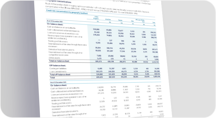 Strategic Shareholder Climate and Risk Financial Financial Barclays PLC 326 report information sustainability report Governance review review statements Annual Report 2022 Risk performance - Credit risk (continued) Analysis of the concentration of credit risk A concentration of credit risk exists when a number of counterparties are located in a common geographical region or are engaged in similar activities and have similar economic characteristics that would cause their ability to meet contractual obligations to be similarly affected by changes in economic or other conditions. The Group implements limits on concentrations in order to mitigate the risk. The analysis of credit risk concentrations presented below are based on the location of the counterparty or customer or the industry in which they are engaged. Further detail on the Group policies with regard to managing concentration risk is presented in the Barclays PLC Pillar 3 Report 2022 (unaudited). Geographic concentrations As at 31 December 2022, the geographic concentration of the Group’s assets remained broadly consistent with 2021. Exposure concentrated in the UK was 38% (2021: 40%), in the Americas 37% (2021: 35%) and in Europe 18% (2021: 19%). Credit risk concentrations by geography (audited) United Africa and Middle Kingdom Americas Europe Asia East Total £m £m £m £m £m £m As at 31 December 2022 On-balance sheet: Cash and balances at central banks 129,000 49,830 73,677 3,553 291 256,351 Cash collateral and settlement balances 42,442 36,572 22,058 10,467 1,058 112,597 Loans and advances at amortised cost 270,554 74,851 32,484 15,504 5,386 398,779 Reverse repurchase agreements and other similar secured lending — 127 380 262 7 776 Trading portfolio assets 9,333 35,490 16,970 5,299 1,581 68,673 Financial assets at fair value through the income statement 30,024 106,741 41,355 20,538 8,819 207,477 Derivative financial instruments 99,053 101,407 77,146 22,299 2,475 302,380 Financial assets at fair value through other comprehensive income 7,692 25,666 18,842 12,562 292 65,054 Other assets 1,473 115 61 4 3 1,656 Total on-balance sheet 589,571 430,799 282,973 90,488 19,912 1,413,743 Off-balance sheet: Contingent liabilities 6,485 11,297 4,811 1,210 402 24,205 Loan commitments 103,575 240,356 44,479 4,334 2,764 395,508 Total off-balance sheet 110,060 251,653 49,290 5,544 3,166 419,713 Total 699,631 682,452 332,263 96,032 23,078 1,833,456 As at 31 December 2021 On-balance sheet: Cash and balances at central banks 114,959 38,735 76,846 7,789 245 238,574 Cash collateral and settlement balances 34,249 28,469 21,822 7,260 742 92,542 Loans and advances at amortised cost 270,261 51,599 24,352 11,039 4,200 361,451 Reverse repurchase agreements and other similar secured lending 9 123 401 2,508 186 3,227 Trading portfolio assets 12,926 29,539 15,092 4,943 889 63,389 Financial assets at fair value through the income statement 28,737 95,478 30,083 21,800 9,999 186,097 Derivative financial instruments 78,710 92,010 75,247 14,709 1,896 262,572 Financial assets at fair value through other comprehensive income 7,661 27,391 19,235 6,164 400 60,851 Other assets 949 223 39 1 — 1,212 Total on-balance sheet 548,461 363,567 263,117 76,213 18,557 1,269,915 Off-balance sheet: Contingent liabilities 5,527 10,328 3,957 1,131 403 21,346 Loan commitments 105,844 192,303 40,523 5,104 1,937 345,711 Total off-balance sheet 111,371 202,631 44,480 6,235 2,340 367,057 Total 659,832 566,198 307,597 82,448 20,897 1,636,972 Industry concentrations The concentration of the Group’s assets by industry remained broadly consistent year on year. As at 31 December 2022, total assets concentrated in banks and other financial institutions was 39% (2021: 38%), predominantly within derivative financial instruments. The proportion of the overall balance concentrated in governments and central banks was 22% (2021: 23%), cards, unsecured loans and other personal lending was 11% (2021: 10%) and in home loans remained stable at 10% (2021: 11%). Further details on material and emerging risks can be found on pages 269 to 281 .