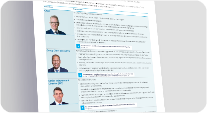Strategic Shareholder Climate and Risk Financial Financial Barclays PLC 152 report information sustainability report Governance review review statements Annual Report 2022 Directors’ report: Our Governance Framework (continued) Division of responsibilities Roles on the Board and Charter of Expectations In line with the provisions of the Code, a clear division of responsibilities has been established between Executive and Non-Executive Directors, as shown in the table below. Our Charter of Expectations sets out individual role profiles and required behaviours and competencies for the Chair, SID, Non- Executive Directors, Executive Directors and Committee Chairs. We review our Charter of Expectations annually, to ensure it remains relevant and accurately reflects the requirements of the Code, the Companies (Miscellaneous Reporting) Regulations 2018 and industry best practice. Role on Board Responsibilities As Chair, Nigel Higgins is responsible for: Chair • leading the Board and its overall effectiveness in directing the company • demonstrating objective judgement • promoting a culture of openness and inclusion, and facilitating and encouraging open constructive challenge and debate between all Directors, and which challenges executives where appropriate • ensuring the Board as a whole has a clear understanding of the views of shareholders • facilitating constructive board relations and the effective contribution of all Non-Executive Directors • ensuring Directors receive all information in an accurate, timely and clear form that is relevant to discharge their obligations • developing and monitoring, with the support of the Board Nominations Committee, effective induction, training and development for the Board. You can read more about the skills and experience Nigel brings to the Board in his biography + on page 143. As the Group Chief Executive, Venkat is supported in his role by the ExCo, and leads the Executive Directors in: Group Chief Executive • making and implementing operational decisions and running the Group's business on a day-to-day basis • leading Barclays towards the achievement of its strategic objectives and implementing the strategy decisions taken by the Board • assisting the Board in considering strategic issues, and ensuring that decisions taken are in the Group's best interests • actively promoting and demonstrating the appropriate culture, values and behaviours of the boardroom, including upholding Barclays' Values and Mindset. You can read more about the skills and experience Venkat brings to the Board in his biography + on page 143 and can find further information on the membership of ExCo on page 148. As our SID, Brian Gilvary: Senior Independent Director (SID) • provides a sounding board for the Chair, serving as a trusted intermediary for the other Directors and shareholders when necessary • is available to shareholders if they have any concerns which contact through the normal engagement channels has failed to resolve, or for which such contact is inappropriate • maintains contact with major shareholders to understand their issues and concerns, and supports the Chair in ensuring the Board is aware of the views of major shareholders • leads the Non-Executive Directors in meeting at least annually to appraise the Chair's performance, and on other occasions as necessary. You can read more about the skills and experience Brian brings to the Board in his biography + on page 143. Our Non-Executive Directors have responsibility for: Non-Executive Directors • providing effective oversight, strategic guidance and constructive challenge, helping to develop proposals on strategy and then empowering the Executive Directors to implement the Group’s strategy while scrutinising and holding to account the performance of management and Executive Directors against agreed performance objectives • having a prime role, led by the Board Nominations Committee, in appointing and, where necessary, removing Executive Directors, and in succession planning for these roles. You can read more about the skills and experience each of our Non-Executive Directors bring + to the Board in their biographies on pages 144 to 146. You can find a copy of our Charter of Expectations , which sets the role profiles and required competencies for each of the roles + described above, at home.barclays/who-we-are/our governance/board-responsibilities.