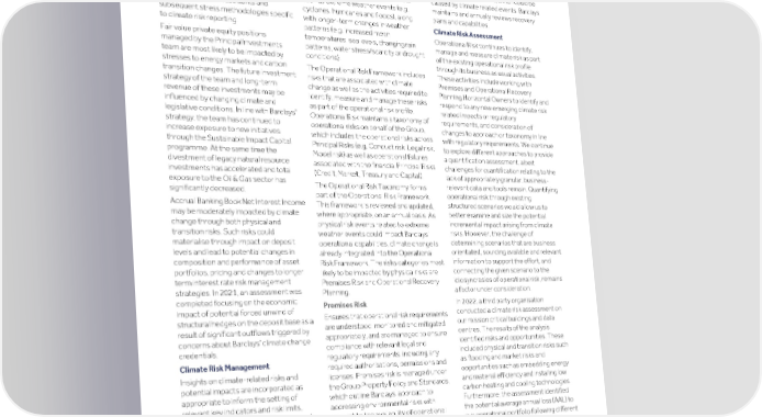 Strategic Shareholder Climate and Risk Financial Financial Barclays PLC 288 report information sustainability report Governance review review statements Annual Report 2022 Principal risk management (continued) general market conditions which could Climate Risk Identification Operational Recovery Planning deteriorate under longer term climate From a climate risk perspective, Barclays is An integral part of the firm’s approach to stress. Physical or transition risks may lead exposed to climate change risks in its Operational Resilience. The purpose is to to government fiscal responses that would operations, either directly or via the enable Barclays to minimise the impact of impact market volatility. Building on operations of its suppliers. This exposure is disruption when it occurs, which could be analysis from 2021 exercises, updates caused by climate related events. Barclays predominantly related to physical risks have been made to climate related such as extreme weather events (e.g. maintains and annually reviews recovery categorisation of investments and cyclones, hurricanes and floods), along plans and capabilities. subsequent stress methodologies specific with longer-term changes in weather Climate Risk Assessment to climate risk reporting. patterns (e.g. increased mean Operational Risk continues to identify, temperatures, sea levels, changing rain Fair value private equity positions manage and measure climate risk as part patterns, water stress/scarcity or drought managed by the Principal Investments of the existing operational risk profile conditions). team are most likely to be impacted by through its business as usual activities. stresses to energy markets and carbon The Operational Risk Framework includes These activities include working with transition changes. The future investment risks that are associated with climate Premises and Operational Recovery strategy of the team and long-term change as well as the activities required to Planning Horizontal Owners to identify and revenue of these investments may be identify, measure and manage these risks respond to any new emerging climate risk influenced by changing climate and as part of the operational risk profile. related impacts or regulatory legislative conditions. In line with Barclays’ Operational Risk maintains a taxonomy of requirements, and consideration of strategy, the team has continued to operational risks on behalf of the Group, changes to approach or taxonomy in line increase exposure to new initiatives which includes the operational risks across with regulatory requirements. We continue through the Sustainable Impact Capital Principal Risks (e.g. Conduct risk, Legal risk, to explore different approaches to provide programme. At the same time the Model risk) as well as operational failures a quantification assessment, albeit divestment of legacy natural resource associated with the financial Principal Risks challenges for quantification relating to the investments has accelerated and total (Credit, Market, Treasury and Capital). lack of appropriately granular, business- exposure to the Oil & Gas sector has relevant data and tools remain. Quantifying The Operational Risk Taxonomy forms significantly decreased. operational risk through existing part of the Operational Risk Framework. Accrual Banking Book Net Interest Income structured scenarios would allow us to This framework is reviewed and updated, may be moderately impacted by climate better examine and size the potential where appropriate, on an annual basis. As change through both physical and incremental impact arising from climate physical risk events related to extreme transition risks. Such risks could risks. However, the challenge of weather events could impact Barclays’ materialise through impact on deposit determining scenarios that are business operational capabilities, climate change is levels and lead to potential changes in orientated, sourcing available and relevant already integrated into the Operational composition and performance of asset information to support the effort, and Risk Framework. The risks categories most portfolios, pricing and changes to longer connecting the given scenario to the likely to be impacted by physical risks are term interest rate risk management idiosyncrasies of operational risk, remains Premises Risk and Operational Recovery strategies. In 2021, an assessment was a factor under consideration. Planning. completed focusing on the economic In 2022, a third party organisation Premises Risk impact of potential forced unwind of conducted a climate risk assessment on Ensures that operational risk requirements structural hedges on the deposit base as a our mission critical buildings and data are understood, monitored and mitigated result of significant outflows triggered by centres. The results of the analysis appropriately, and are managed to ensure concerns about Barclays’ climate change identified risks and opportunities. These compliance with relevant legal and credentials. included physical and transition risks such regulatory requirements, including any Climate Risk Management as flooding and market risks and required authorisations, permissions and opportunities such as embedding energy Insights on climate-related risks and licenses. Premises risk is managed under and material efficiency and installing low potential impacts are incorporated as the Group Property Policy and Standards, carbon heating and cooling technologies. appropriate to inform the setting of which outline Barclays’ approach to Furthermore, the assessment identified relevant key indicators and risk limits, addressing environmental risks with the potential average annual loss (AAL) to which are overseen by the Treasury and respect to the availability of operational our operational portfolio following different Capital Risk Committee on a quarterly premises. This Policy defines a low climate scenarios. In a low emissions basis. Barclays’ 