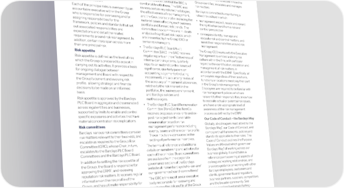 Strategic Shareholder Climate and Risk Financial Financial Barclays PLC 268 report information sustainability report Governance review review statements Annual Report 2022 Risk management (continued) Principal risks • The Barclays PLC Board Risk Barclays’ risk culture Committee (BRC): the BRC monitors The ERMF identifies nine principal risks Risk culture can be defined as the norms, the Group’s risk profile against the namely: credit risk, market risk, treasury attitudes and behaviours related to risk agreed appetite. Where actual and capital risk, climate risk, operational awareness, risk taking and risk performance differs from expectations, risk, model risk, conduct risk, reputation management. This is reflected in how the the actions taken by management are risk and legal risk. Note that climate risk Group identifies, escalates and manages reviewed to ascertain that the BRC is was added in January 2022; see page 273 risk matters. comfortable with them. The BRC also for more information. Barclays is committed to maintaining a reviews certain key risk methodologies, Each of the principal risks is overseen by an robust risk culture in which: the effectiveness of risk management, accountable executive within the Group and the Group’s risk profile, including the • management expect, model and reward who is responsible for overseeing and/or material issues affecting each business the right behaviours from a risk and assigning responsibilities for the portfolio and forward risk trends. The control perspective framework, policies and standards that set committee also commissions in-depth • colleagues identify, manage and out associated responsibilities and analysis of significant risk topics, which escalate risk and control matters, and expectations and detail the related are presented by the Group CRO or meet their responsibilities around risk requirements around risk management. In senior risk managers. management. addition, certain risks span across more • The Barclays PLC Board Audit than one principal risk. The Group CEO works with the Executive Committee (BAC): the BAC receives Management to embed a strong risk Risk appetite regular reports on the effectiveness of culture within the firm, with particular Risk appetite is defined as the level of risk internal control systems, quarterly regard to the identification, escalation and which the Group is prepared to accept in reports on material control issues of management of risk matters, in carrying out its activities. It provides a basis significance, quarterly papers on accordance with the ERMF. Specifically, all for ongoing dialogue between accounting judgements (including employees regardless of their positions, management and Board with respect to impairment), and a quarterly review of functions or locations must play their part the Group’s current and evolving risk the adequacy of impairment allowances, in the Group’s risk management. profile, allowing strategic and financial relative to the risk inherent in the Employees are required to be familiar with decisions to be made on an informed portfolios, the business environment, risk management policies which are basis. and Barclays policies and relevant to their responsibilities, know how Risk appetite is approved by the Barclays methodologies. to escalate actual or potential risk issues, PLC Board in aggregate and disseminated • The Barclays PLC Board Remuneration and have a role-appropriate level of across legal entities and businesses, Committee (RemCo): the RemCo awareness of the risk management supported by limits to enable and control receives proposals on ex-ante and ex- process as defined by the ERMF. specific exposures and activities that have post risk adjustments to variable Our Code of Conduct – the Barclays Way material concentration risk implications. remuneration based on risk Globally, all colleagues must attest to the Risk committees management performance including ‘Barclays Way’, our Code of Conduct, and events, issues and the wider risk profile. Barclays various risk committees consider comply with all frameworks, policies and These inputs are considered in the risk matters relevant to their business, and standards applicable to their roles. The setting of performance incentives. escalate as required to the Group Risk Code of Conduct outlines the Purpose, Committee (GRC), whose Chair, in turn, The terms of reference and additional Values and Mindset which govern our escalates to the Barclays PLC Board details on membership and activities for ‘Barclays Way’ of working across our Committees and the Barclays PLC Board. each of the principal Board committees business globally. It constitutes a are available from the corporate In addition to setting the risk appetite of reference point covering all aspects of governance section of the Barclays the Group, the Board is responsible for colleagues’ working relationships, and website at: home.barclays/who-we-are/ approving the ERMF, and reviewing provides guidance on working with other our-governance/board-committees/ reputation risk matters. It receives regular Barclays employees, customers and information on the risk profile of the clients, governments and regulators, The GRC is the most senior executive Group, and has ultimate responsibility for business partners, suppliers, competitors body responsible for reviewing and risk appetite and capital plans. and the broader community. See monitoring the risk profile of the Group. home.barclays/sustainability/esg- This includes coverage of all principal risks, Further, there are two Board-level resource-hub/statements-and-policy- and any other material risks, to which the committees which oversee the application positions/ for more details. Group is exposed. The GRC reviews and of the ERMF and implementation of key recommends the proposed risk appetite aspects, the Barclays PLC Board Risk and relative limits to the BRC. The Committee (BRC) and th