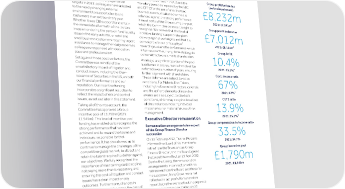 Strategic Shareholder Climate and Risk Financial Financial Barclays PLC 199 report information sustainability report Governance review review statements Annual Report 2022 Remuneration report (continued) This year’s incentive pool reflects all the The Committee considered this range of Group income elements set out at the start of this complex factors and concluded that this statement. The Committee wanted to year’s incentive funding achieves the right £24,956m recognise the strong performance across balance. A significant downward our three operating businesses, and in adjustment of c.£500m to reflect risk and 2021: £21,940m particular that of our Global Markets control issues, including the Over- Group profit before tax business. As well as good operating issuance of Securities in the US and the (before impairment) performance and delivery against our monetary penalties imposed by the SEC targets in 2022, colleagues have adapted and CFTC for the use of unauthorised to the rapidly changing external business communications channels, is £8,232m environment to support clients and balanced against the strong performance a 2021: £7,541m customers in an extraordinary year. in most parts of the Group during the year, Whether it was CIB support for clients in which the Committee believes it is right to Group profit before tax the immediate aftermath of the Ukraine recognise. We believe that this level of invasion or during the pension fund liquidity incentive funding is appropriate given £7,012m issue in the early autumn, or retail and delivery against our targets and that it is a small business customers requiring urgent consistent with our philosophy of 2021: £8,194m assistance to manage their daily expenses, rewarding sustainable performance, which Group RoTE colleagues responded with dedication, in turn supports our long-term strategy to pace and professionalism. deliver attractive returns to shareholders. Set against those positive factors, the As always, a significant portion of the pool 10.4% Committee was mindful of the is delivered in shares, most of which will be a 2021: 13.1% unsatisfactory impact of litigation and deferred over a number of years, ensuring conduct issues, including the Over- further alignment with shareholders. Cost: income ratio issuance of Securities in the US, on both Those deferrals are subject to malus our financial performance and our conditions. For Material Risk Takers, 67% reputation. Our incentive funding including the Executive Directors, deferrals a and the upfront elements of incentive incorporates a significant reduction to 2021: 67% reflect the impact of risk and control awards are also subject to clawback CET1 ratio issues, as set out later in this statement. conditions, which may apply in a broad set of circumstances including individual Taking all of this into account, the misbehaviour or material failures of risk Committee has approved a Group 13.9% management. incentive pool of £1,790m (2021: a 2021: 15.1% £1,945m). This level of incentive pool Executive Director remuneration funding has enabled us to recognise the Group compensation to income ratio Remuneration arrangements in respect strong performance that has been of the Group Finance Director achieved and to reward the teams and succession 33.5% individuals responsible for that On 22 February 2022, Tushar Morzaria performance. It has also allowed us to 2021: 34.7% informed the Board of his intention to continue to manage the challenges of the retire from the Board and as Group Group incentive pool competitive global market, to attract and Finance Director, and the Board agreed retain the talent required to deliver against that would take effect on 22 April 2022. our objectives. We fully recognised the £1,790m Due to the timing, the remuneration importance of maintaining cost discipline, arrangements in connection with his 2021: £1,945m not paying more than is necessary, and retirement from the Board and those for ensuring the cost of litigation and conduct his successor, Anna Cross, were not issues has a clear impact on pay reflected in last year’s Remuneration outcomes. Furthermore, changes in report but rather were set out in a separate foreign exchange rates mean the cost of announcement to the market on 23 paying bonuses outside the UK has February 2022. increased year-on-year so in practice the incentive pool is down more than it appears at the headline level. Note a 2021 financial and capital metrics have been restated to reflect the impact of the Over-issuance of Securities. See Impact of the Over-issuance of Securities on page 356 and Restatement of financial statements (Note 1a) on page 428 for further details.