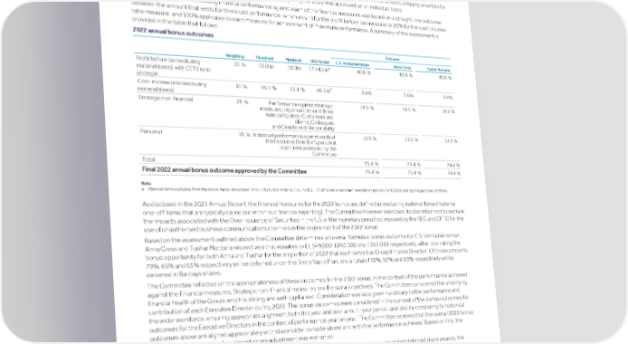 Strategic Shareholder Climate and Risk Financial Financial Barclays PLC 219 report information sustainability report Governance review review statements Annual Report 2022 Remuneration report (continued) 4) 2022 annual bonus The bonus amount included in the single total figure is the value awarded or scheduled to be awarded in Q1 following the financial year to which it relates. In determining the bonus in respect of 2022 performance, the Committee considered the performance achieved against the Financial (60% weighting) and Strategic non-financial (25% weighting) performance measures that had been set to reflect Company priorities for 2022. Performance against their personal objectives (15% weighting) for 2022 was assessed on an individual basis. The approach taken to assessing financial performance against each of the financial measures was based on a straight-line outcome between the amount that vests for threshold performance, which was nil for the profit before tax measure or 20% for the cost: income ratio measure, and 100% applicable to each measure for achievement of maximum performance. A summary of the assessment is provided in the table that follows. 2022 annual bonus outcomes Outcome Weighting Threshold Maximum 2022 Actual C.S. Venkatakrishnan Anna Cross Tushar Morzaria a Profit before tax (excluding 50 % £5.0bn £8.0bn £7.445bn 40.8 % 40.8 % 40.8 % material items), with CET1 ratio underpin a Cost: income ratio (excluding 10 % 66.1 % 62.1 % 65.3% 3.6% 3.6% 3.6% material items) Strategic non-financial 25 % Performance against strategic 18.0 % 18.0 % 18.0 % measures, organised around three main categories: Customers and clients, Colleagues and Climate and Sustainability Personal 15 % Individual performance against each of 13.0 % 13.0 % 12.0 % the Executive Director's personal objectives assessed by the Committee Total 75.4 % 75.4 % 74.4 % 75.4 % 75.4 % 74.4 % Final 2022 annual bonus outcome approved by the Committee Note a Material items excluded from the above measures consist of structural cost actions £151m (2021: £648m) and a customer remediation provision of £282m relating to legacy loan portfolios. As disclosed in the 2021 Annual Report, the financial measures for the 2022 bonus are defined as excluding material items (material one-off items that are typically called out within our financial reporting). The Committee however exercised its discretion not to exclude the impacts associated with the Over-issuance of Securities in the US or the monetary penalties imposed by the SEC and CFTC for the use of unauthorised business communications channels in the assessment of the 2022 bonus. Based on the assessment outlined above, the Committee determined an overall formulaic bonus outcome for C.S. Venkatakrishnan, Anna Cross and Tushar Morzaria respectively that equates to £1,949,000, £803,000 and £362,000 respectively, after pro-rating the bonus opportunity for both Anna and Tushar for the proportion of 2022 that each served as Group Finance Director. Of those amounts, 79%, 66% and 65% respectively will be deferred under the Share Value Plan, and a total of 90%, 83% and 83% respectively will be delivered in Barclays shares. The Committee reflected on the appropriateness of these outcomes for the 2022 bonus, in the context of the performance achieved against the Financial measures, Strategic non-financial measures and Personal objectives. The Committee considered the underlying financial health of the Group, which is strong and well-capitalised. Consideration was also given holistically to the performance and contribution of each Executive Director during 2022. The bonus outcomes were considered in the context of the bonus outcomes for the wider workforce, ensuring appropriate alignment both this year and over a multi-year period, and also by comparing to historical outcomes for the Executive Directors in the context of performance year on year. The Committee believes that the overall 2022 bonus outcomes above are aligned appropriately with stakeholder considerations and with the performance achieved. Based on this, the Committee concluded that no discretionary adjustment was warranted. In line with the DRP, and due to the regulations prohibiting dividend equivalents being paid on unvested deferred share awards, the number of shares awarded to each Executive Director under the Share Value Plan (the Group's main employee share plan for granting deferred bonus shares to employees) will be calculated using the share price at the date of award, discounted to reflect the absence of dividend equivalents during the vesting period. The valuation will be aligned to IFRS 2, with the market expectations of dividends during the deferral period being assessed by an independent adviser. The deferred bonus shares in respect of the 2022 annual bonus for C.S. Venkatakrishnan and Anna Cross will vest in two equal tranches on the first and second anniversary of grant. The deferred bonus shares for Tushar Morzaria will vest in equal tranches on the first four anniversaries of grant, which is the standard based on the nature of his current role. All shares (whether deferred or not) are subject to a further one-year holding period from the point of vesting. 2022 bonuses are subject to clawback provisions and the deferred elements of 2022 bonuses are subject to malus provisions, which enable the Committee to delay or reduce the vesting of unvested deferred bonuses (including reducing to nil). Further detail follows on the assessment of the Strategic non-financial measures, and performance against Personal objectives where applicable.