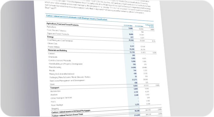 Strategic Shareholder Climate and Risk Financial Financial Barclays PLC 298 report information sustainability report Governance review review statements Annual Report 2022 Risk performance - Climate risk (continued) Financing To facilitate greater understanding and transparency of our capital markets financing, we disclose the total capital raised for clients across all sectors using data sourced from Dealogic. We have provided the breakdown of our 2021 and 2022 financing below. Barclays discloses the total capital raised for clients across all sectors using data sourced from Dealogic. We then align each transaction by issuer to a sector according to the Barclays Industry Classification (BIC) we apply to that issuer. BIC is Barclays' internal sector classification system. The industry sector categories are designated by Dealogic General and Specific Industry Group classifications. Financing volumes are reported on a manager-proceeds basis including bonds, equities, loans and securitised bonds and no modifications have been made by Barclays. This data represents a third party view of our financing and is subject to Dealogic’s league table methodology, which pro-rates volume across lead-managers. We are presenting the data in this format to support transparency and comparability but it should be noted that this data is subject to further analysis and methodological enhancements, before it is included in BlueTrack™. Carbon-related sectors in wholesale credit (Dealogic Industry Classification) % Change (2022 vs. 2021) 31.12.2022 ($m) 31.12.2021 ($m) Agriculture, Food and Forest Products 9,486 18,416 (48) % Agriculture - 382 Food, Bev and Tobacco 8,609 14,997 Paper and Forest Products 877 3,037 Energy 43,042 39,294 10 % Coal Mining and Coal Terminals - - Oil and Gas 9,747 12,558 Power Utilities 33,295 26,736 Materials and Building 33,750 63,473 (47) % Cement 200 - Chemicals 2,800 4,876 Construction and Materials 3,006 3,181 Homebuilding and Property Development 760 976 Manufacturing 14,062 28,482 Metals 744 1,130 Mining (Incl. diversified miners) 436 2,515 Packaging Manufacturers: Metal, Glass and Plastics 33 932 Real Estate Management and Development 11,271 20,860 Steel 438 521 Transport 9,904 23,559 (58) % Automotive 3,865 9,961 Aviation 2,132 6,221 Other Transport Services 2,648 3,947 Ports - 124 Road Haulage - 1,062 Shipping 1,259 2,244 Carbon-related assets in UK Retail Mortgages - - - Carbon-related Sectors Grand Total 96,182 144,742 (34) % Capital Market Financing Total 374,899 549,118 (32) % Financing to Carbon-related Sector over Total Capital Market Financing 26 % 26 %