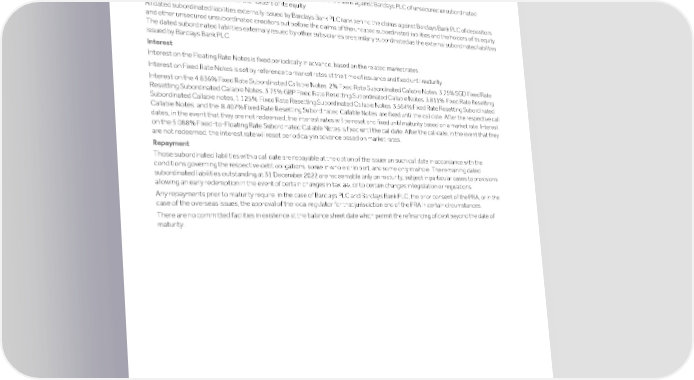 Strategic Shareholder Climate and Risk Financial Financial Barclays PLC 487 report information sustainability report Governance review review statements Annual Report 2022 Notes to the financial statements (continued) Capital instruments, equity and reserves Dated subordinated liabilities Dated subordinated liabilities are issued by Barclays PLC, Barclays Bank PLC and its subsidiaries for the development and expansion of their businesses and to strengthen their respective capital bases. The principal terms of the dated subordinated liabilities are described below: Subordination Dated subordinated liabilities issued by Barclays PLC ranks behind the claims against Barclays PLC of unsecured unsubordinated creditors but before the claims of the holders of its equity. All dated subordinated liabilities externally issued by Barclays Bank PLC rank behind the claims against Barclays Bank PLC of depositors and other unsecured unsubordinated creditors but before the claims of the undated subordinated liabilities and the holders of its equity. The dated subordinated liabilities externally issued by other subsidiaries are similarly subordinated as the external subordinated liabilities issued by Barclays Bank PLC. Interest Interest on the Floating Rate Notes is fixed periodically in advance, based on the related market rates. Interest on Fixed Rate Notes is set by reference to market rates at the time of issuance and fixed until maturity. Interest on the 4.836% Fixed Rate Subordinated Callable Notes, 2% Fixed Rate Subordinated Callable Notes, 3.75% SGD Fixed Rate Resetting Subordinated Callable Notes, 3.75% GBP Fixed Rate Resetting Subordinated Callable Notes, 3.811% Fixed Rate Resetting Subordinated Callable notes, 1.125% Fixed Rate Resetting Subordinated Callable Notes, 3.564% Fixed Rate Resetting Subordinated Callable Notes, and the 8.407% Fixed Rate Resetting Subordinated Callable Notes are fixed until the call date. After the respective call dates, in the event that they are not redeemed, the interest rates will be reset and fixed until maturity based on a market rate. Interest on the 5.088% Fixed-to-Floating Rate Subordinated Callable Notes is fixed until the call date. After the call date, in the event that they are not redeemed, the interest rate will reset periodically in advance based on market rates. Repayment Those subordinated liabilities with a call date are repayable at the option of the issuer on such call date in accordance with the conditions governing the respective debt obligations, some in whole or in part, and some only in whole. The remaining dated subordinated liabilities outstanding at 31 December 2022 are redeemable only on maturity, subject in particular cases to provisions allowing an early redemption in the event of certain changes in tax law, or to certain changes in legislation or regulations. Any repayments prior to maturity require, in the case of Barclays PLC and Barclays Bank PLC, the prior consent of the PRA, or in the case of the overseas issues, the approval of the local regulator for that jurisdiction and of the PRA in certain circumstances. There are no committed facilities in existence at the balance sheet date which permit the refinancing of debt beyond the date of maturity.