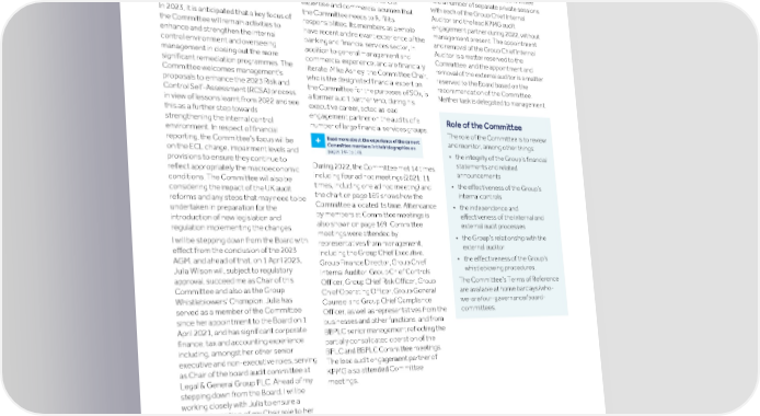 Strategic Shareholder Climate and Risk Financial Financial Barclays PLC 171 report information sustainability report Governance review review statements Annual Report 2022 Directors’ report: Board Audit Committee report (continued) Marc Moses recently joined the The Board, together with the Committee, Committee composition and Committee on taking up his appointment is responsible for ensuring the meetings as a Non-Executive Director of the Board independence and effectiveness of the The Committee is composed solely of on 23 January 2023. Marc brings a strong internal audit function and external independent Non-Executive Directors. technical finance background with a deep auditors. For this reason, the Committee Membership of the Committee is designed knowledge of banking and financial held a number of separate private sessions to provide the breadth of financial services. with each of the Group Chief Internal expertise and commercial acumen that Looking ahead Auditor and the lead KPMG audit the Committee needs to fulfil its engagement partner during 2022, without In 2023, it is anticipated that a key focus of responsibilities. Its members as a whole management present. The appointment the Committee will remain activities to have recent and relevant experience of the and removal of the Group Chief Internal enhance and strengthen the internal banking and financial services sector, in Auditor is a matter reserved to the control environment and overseeing addition to general management and Committee, and the appointment and management in closing out the more commercial experience; and are financially removal of the external auditor is a matter significant remediation programmes. The literate. Mike Ashley, the Committee Chair, reserved to the Board based on the Committee welcomes management's who is the designated financial expert on recommendation of the Committee. proposals to enhance the 2023 Risk and the Committee for the purposes of SOx, is Neither task is delegated to management. Control Self-Assessment (RCSA) process a former audit partner who, during his in view of lessons learnt from 2022 and see executive career, acted as lead this as a further step towards engagement partner on the audits of a Role of the Committee strengthening the internal control number of large financial services groups. The role of the Committee is to review environment. In respect of financial Read more about the experience of the current and monitor, among other things: reporting, the Committee’s focus will be + Committee members in their biographies on pages 144 to 146. on the ECL charge, impairment levels and • the integrity of the Group’s financial provisions to ensure they continue to statements and related During 2022, the Committee met 14 times reflect appropriately the macroeconomic announcements including four ad hoc meetings (2021: 11 conditions. The Committee will also be • the effectiveness of the Group’s times, including one ad hoc meeting) and considering the impact of the UK audit internal controls the chart on page 169 shows how the reforms and any steps that may need to be Committee allocated its time. Attendance • the independence and undertaken in preparation for the by members at Committee meetings is effectiveness of the internal and introduction of new legislation and also shown on page 169. Committee external audit processes regulation implementing the changes. meetings were attended by • the Group’s relationship with the I will be stepping down from the Board with representatives from management, external auditor effect from the conclusion of the 2023 including the Group Chief Executive, • the effectiveness of the Group’s AGM, and ahead of that, on 1 April 2023, Group Finance Director, Group Chief whistleblowing procedures. Julia Wilson will, subject to regulatory Internal Auditor, Group Chief Controls approval, succeed me as Chair of this The Committee’s Terms of Reference Officer, Group Chief Risk Officer, Group Committee and also as the Group are available at home.barclays/who- Chief Operating Officer, Group General Whistleblowers' Champion. Julia has we-are/our-governance/board- Counsel and Group Chief Compliance served as a member of the Committee committees. Officer, as well as representatives from the since her appointment to the Board on 1 businesses and other functions, and from April 2021, and has significant corporate BBPLC senior management reflecting the finance, tax and accounting experience partially consolidated operation of the including, amongst her other senior BPLC and BBPLC Committee meetings. executive and non-executive roles, serving The lead audit engagement partner of as Chair of the board audit committee at KPMG also attended Committee Legal & General Group PLC. Ahead of my meetings. stepping down from the Board, I will be working closely with Julia to ensure a smooth transition of my Chair role to her and I am confident that she will make an excellent Chair of the Committee. Finally, I would like to formally record my thanks to my fellow Committee members, members of senior management, BIA and our external auditors for their support during my tenure as Committee Chair. Mike Ashley Chair, Board Audit Committee 14 February 2023