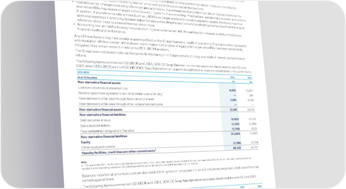 Strategic Shareholder Climate and Risk Financial Financial Barclays PLC 515 report information sustainability report Governance review review statements Annual Report 2022 Notes to the financial statements (continued) Other disclosure matters ▪ Financial risk: the valuation of certain of the Group’s financial assets and liabilities may change. Moreover, transitioning to alternative RFRs may impact the ability of members of the Group to calculate and model amounts receivable by them on certain financial assets and determine the amounts payable on certain financial liabilities (such as debt securities issued by them) because certain alternative RFRs (such as SONIA and the SOFR) are look-back rates whereas term rates (such as LIBOR) allow borrowers to calculate at the start of any interest period exactly how much is payable at the end of such interest period. This may have a material adverse effect on the Group’s cash flows. ▪ Pricing risk: changes to existing reference rates and indices, discontinuation of any reference rate or indices and transition to alternative RFRs may impact the pricing mechanisms used by the Group on certain transactions. ▪ Operational risk: changes to existing reference rates and indices, discontinuation of any reference rate or index and transition to alternative RFRs may require changes to the Group’s IT systems, trade reporting infrastructure, operational processes, and controls. In addition, if any reference rate or index (such as LIBOR) is no longer available to calculate amounts payable, the Group may incur additional expenses in amending documentation for new and existing transactions and/or effecting the transition from the original reference rate or index to a new reference rate or index. ▪ Accounting risk: an inability to apply hedge accounting in accordance with IAS 39 could lead to increased volatility in the Group’s financial results and performance. Any of these factors may have a material adverse effect on the Group’s business, results of operations, financial condition, prospects, and reputation. While a number of the above risks in relation to transition of legacy 2021 scope onto RFRs have been substantially mitigated, they remain relevant in relation to USD LIBOR transitions. The Group does not expect material changes to its risk management approach and strategy as a result of interest rate benchmark reform. The following tables summarise USD LIBOR and USD LIBOR ICE Swap Rate non-derivatives exposures due to mature post 30 June 2023, when USD LIBOR and the USD LIBOR ICE Swap Rate will either cease to be published or cease to be published, in its current form: USD LIBOR 2022 2021 As at 31 December £m £m Non-derivative financial assets Loans and advances at amortised cost 8,659 15,812 Reverse repurchase agreements and other similar secured lending — 186 Financial assets at fair value through the income statement 4,282 8,538 Financial assets at fair value through other comprehensive income — — Non-derivative financial assets 12,941 24,536 Non-derivative financial liabilities Debt securities in issue (9,062) (6,137) Subordinated liabilities (1,132) (1,088) Financial liabilities designated at fair value (1,740) (212) Non-derivative financial liabilities (11,934) (7,437) Equity Other equity instruments (1,786) (3,374) a Standby facilities, credit lines and other commitments 68,118 42,767 Note a For year ended 2021, multi currency loan facilities are reported in the currency which needs to be remediated first, which were mainly non-USD. As the non-USD rates transitioned, this has resulted in a corresponding increase in USD LIBOR exposure for year ended 2022 as USD LIBOR exposure is yet to transition. Balances reported at amortised cost are disclosed at their gross carrying value and do not include any expected credit losses that may be held against them. The following tables summarise USD LIBOR and USD LIBOR ICE Swap Rate derivative exposures due to mature post 30 June 2023: USD LIBOR 2022 2021 £m £m Derivative notional contract amount OTC interest rate derivatives 2,594,268 2,283,236 OTC interest rate derivatives - cleared by central counterparty 2,137,245 2,228,399 Exchange traded interest rate derivatives 337,535 466,339 OTC foreign exchange derivatives 84 461,680 OTC equity and stock index derivatives 1,261 9,949 Derivative notional contract amount 5,070,393 5,449,603 Derivatives are reported using the notional contract amount As at 31 December 2022 the Group also had £9bn (2021: £9bn) of Barclays issued debt retained by the group, impacted by the interest rate benchmark reform, in USD LIBOR.