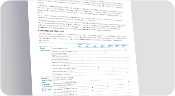 Strategic Shareholder Climate and Risk Financial Financial Barclays PLC 245 report information sustainability report Governance review review statements Annual Report 2022 Remuneration report (continued) Committee effectiveness in 2022 The 2022 Committee effectiveness review was facilitated internally in accordance with the Code. This internal review involved completion of a tailored questionnaire by Committee members and standing attendees, in line with the approach adopted for all Board Committees in 2022. The review is an important part of the way Barclays monitors and improves Committee performance and effectiveness, maximising strengths and highlighting areas for further development. The results of the review confirm the Committee is operating effectively. It is considered to be well constituted, providing an effective and appropriate level of challenge and oversight of the areas within its remit, including in respect of complex judgements. The review noted that the Committee allocates time appropriately to cover its remit effectively in meetings, with sufficient time for discussion and challenge. The review acknowledged that Committee meetings are chaired effectively, with the Chair encouraging debate through an inclusive approach. In light of Crawford Gillies having stepped down as Committee Chair in February 2021, and the role of Chair having been assumed by an existing Committee member, consideration will be given to adding an additional member of the Committee in due course. The Committee’s interaction with the Board, Board Committees and senior management is considered effective, with the review noting the strong level of support provided to the Committee by senior management. Following the consolidation of the membership of the Committee with the BBPLC Board Remuneration Committee in September 2019 (with the exception of the Committee Chair, who attends as an observer only for matters relating to BBPLC), coverage of BBPLC matters within aligned meetings is considered adequate. The Committee’s interaction with the BBPLC and BBUKPLC Board Remuneration Committees was also considered effective, and operates in line with regulatory requirements. Committee activity in 2022 The following table summarises the Committee’s activity during 2022, and at the January and February 2023 meetings at which 2022 remuneration decisions were finalised. The Committee is also provided with updates at each scheduled meeting on: the operation of the Committee’s Control Framework on hiring, retention and termination; headcount and employee attrition; and extant LTIP performance. January February June October December January February 2022 2022 2022 2022 2022 2023 2023 Overall Finance and Risk updates ▪ ▪ ▪ ▪ ▪ ▪ ▪ remuneration Incentive funding proposals including risk ▪ ▪ ▪ ▪ ▪ ▪ and control adjustments 2021 Remuneration Report ▪ ▪ Group Fixed Pay budgets ▪ ▪ ▪ ▪ ▪ ▪ Wider workforce considerations ▪ ▪ ▪ ▪ ▪ ▪ ▪ Incentive funding approach ▪ Barclays’ Fair Pay Agenda and Report ▪ ▪ ▪ ▪ ▪ ▪ Directors' Remuneration Policy ▪ ▪ ▪ ▪ ▪ 2022 Remuneration Report ▪ ▪ ▪ Executive Executive Directors’ and senior ▪ ▪ ▪ ▪ ▪ Directors’ and executives’ bonus outcomes senior Annual bonus and LTIP performance executives’ ▪ ▪ ▪ ▪ measures and target calibration remuneration Governance Regulatory and stakeholder matters ▪ ▪ ▪ ▪ ▪ ▪ ▪ Discussion with independent adviser ▪ ▪ ▪ ▪ ▪ ▪ ▪ Remuneration Review Panel update ▪ ▪ ▪ ▪ Review of Committee effectiveness ▪ ▪ There were two additional Committee meetings, one each in February 2022 and November 2022, the first to consider the remuneration aspects related to Group Finance Director succession and the second to consider remuneration for a number of senior positions.
