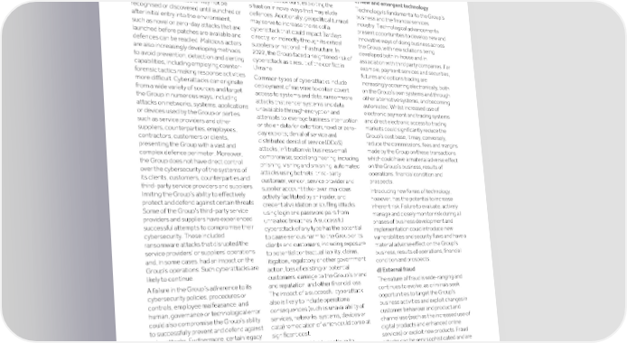 Strategic Shareholder Climate and Risk Financial Financial Barclays PLC 277 report information sustainability report Governance review review statements Annual Report 2022 Material existing and emerging risks (continued) cannot provide absolute security against contractors, and third party service For further details on the Group’s approach to cyberattacks, see the operational risk + cyberattacks. Malicious actors are providers and suppliers and their performance section. For further details on increasingly sophisticated in their subcontractors as a long-term cybersecurity regulation applicable to the Group, refer to the Supervision and regulation methods, tactics, techniques and consequence of the COVID-19 pandemic. section. procedures, seeking to steal money, gain Bad actors have taken advantage of unauthorised access to, destroy or remote working practices and modified c) New and emergent technology manipulate data, and disrupt operations, customer behaviours, exploiting the Technology is fundamental to the Group’s and some of their attacks may not be situation in novel ways that may elude business and the financial services recognised or discovered until launched or defences. Additionally, geopolitical turmoil industry. Technological advancements after initial entry into the environment, may serve to increase the risk of a present opportunities to develop new and such as novel or zero-day attacks that are cyberattack that could impact Barclays innovative ways of doing business across launched before patches are available and directly, or indirectly through its critical the Group, with new solutions being defences can be readied. Malicious actors suppliers or national infrastructure. In developed both in-house and in are also increasingly developing methods 2022, the Group faced a heightened risk of association with third party companies. For to avoid prevention, detection and alerting cyberattack as a result of the conflict in example, payment services and securities, capabilities, including employing counter- Ukraine. futures and options trading are forensic tactics making response activities increasingly occurring electronically, both Common types of cyberattacks include more difficult. Cyberattacks can originate on the Group’s own systems and through deployment of malware to obtain covert from a wide variety of sources and target other alternative systems, and becoming access to systems and data; ransomware the Group in numerous ways, including automated. Whilst increased use of attacks that render systems and data attacks on networks, systems, applications electronic payment and trading systems unavailable through encryption and or devices used by the Group or parties and direct electronic access to trading attempts to leverage business interruption such as service providers and other markets could significantly reduce the or stolen data for extortion; novel or zero- suppliers, counterparties, employees, Group’s cost base, it may, conversely, day exploits; denial of service and contractors, customers or clients, reduce the commissions, fees and margins distributed denial of service (DDoS) presenting the Group with a vast and made by the Group on these transactions attacks; infiltration via business email complex defence perimeter. Moreover, which could have a material adverse effect compromise; social engineering, including the Group does not have direct control on the Group’s business, results of phishing, vishing and smishing; automated over the cybersecurity of the systems of operations, financial condition and attacks using botnets; third-party its clients, customers, counterparties and prospects. customer, vendor, service provider and third-party service providers and suppliers, supplier account take-over; malicious Introducing new forms of technology, limiting the Group’s ability to effectively activity facilitated by an insider; and however, has the potential to increase protect and defend against certain threats. credential validation or stuffing attacks inherent risk. Failure to evaluate, actively Some of the Group’s third-party service using login and password pairs from manage and closely monitor risk during all providers and suppliers have experienced unrelated breaches. A successful phases of business development and successful attempts to compromise their cyberattack of any type has the potential implementation could introduce new cybersecurity. These included to cause serious harm to the Group or its vulnerabilities and security flaws and have a ransomware attacks that disrupted the clients and customers, including exposure material adverse effect on the Group’s service providers’ or suppliers’ operations to potential contractual liability, claims, business, results of operations, financial and, in some cases, had an impact on the litigation, regulatory or other government condition and prospects. Group's operations. Such cyberattacks are action, loss of existing or potential d) External fraud likely to continue. customers, damage to the Group’s brand The nature of fraud is wide-ranging and and reputation, and other financial loss. A failure in the Group’s adherence to its continues to evolve, as criminals seek cybersecurity policies, procedures or The impact of a successful cyberattack opportunities to target the Group’s controls, employee malfeasance, and also is likely to include operational business activities and exploit changes in human, governance or technological error consequences (such as unavailability of customer behaviour and product and could also compromise the Group’s ability services, networks, systems, devices or channel use (such as the increased use of data) remediation of which could come at to successfully prevent and defend against digital products and enhanced online cyberattacks. Furthermore, certain legacy significant cost. services) or exploit new products. Fraud technologies that are at or approaching Regulato