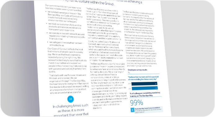 Strategic Shareholder Climate and Risk Financial Financial Barclays PLC 256 report information sustainability report Governance review review statements Annual Report 2022 ESG: Governance (continued) The Barclays Way The Barclays Way is our Code of Conduct. Together with more formal policies and practices, this provides a clear path towards achieving a positive and dynamic culture within the Group. Our commitment to being a responsible The Barclays Way was launched in 2013, The Barclays Way also includes advice and business includes seeking to ensure that: replacing a number of existing codes of guidance on speaking up and raising conduct with a single document. Endorsed concerns. It is important for the success of • we conduct ourselves in line with The by our Chairman, it governs our way of Barclays, and for the safety and wellbeing Barclays Way, our Code of Conduct, to working across our business globally and of our customers, clients and colleagues, create the best possible working constitutes a reference point covering all that we encourage a culture that supports environment for our colleagues aspects of colleagues’ working speaking up when things aren’t as they • we treat our customers fairly and the relationships, specifically but not should be. All colleagues are required to products and services we deliver are exclusively with other Barclays employees, undertake training on The Barclays Way. transparent and responsible customers and clients, governments, We know that our success over the long • we operate in line with relevant laws and regulators, business partners, suppliers, term is based not just on how well we run regulations including those applicable to competitors and the broader community. the organisation commercially, but also on financial crime It is aligned to the Code of Professional how well we manage it to protect the • we safeguard the data that has been Conduct, published by the Chartered environment, support positive social entrusted to us. Banker Professional Standards Board, progress and make responsible, well- which sets out the ethical and professional governed decisions. We are focused on Our Code of Conduct reflects the trust attitudes and behaviours expected of the areas where we can have the greatest that millions of people place in us every bankers. Barclays subscribes to this code long-term impact: making growth ‘green’, day. We know that trust is earned by and is committed to embedding its broad sustainable and inclusive; managing the repeatedly doing the right thing. We principles into our business. environmental and social impacts of our believe the best way to build that trust is to business; running a responsible business; invest in our culture and support our The Barclays Way includes information and and investing in our communities. people in the choices they make every day, guidance on how employees are expected with guidance and policies that help them to behave and take personal accountability Employee survey results do this. for making decisions. We apply a range of % criteria, over and above financial That starts with our Purpose, Values and considerations, aimed at building a "I believe that my team and I do a good job Mindset, and is locked into our of role modelling the Values every day" sustainable, strong and profitable business organisation through The Barclays Way, for the long term and adding value to our the touchstone for everyone in Barclays on 2022 92 business relationships and the broader the standard of conduct we expect, setting communities in which we live and work. We an unequivocal tone from the top about 2021 92 provide guidance across all key who we are and what we stand for. stakeholder groups, including servicing our % of colleagues completing mandatory customers and clients, promoting respect, training on The Barclays Way diversity and performance in the workplace and maintaining strong governance, In challenging times such robust controls and strict ethical 99% standards. as these, it is more The Barclays Way Code of Conduct is available at: + home.barclays/citizenship/the-way-we-do-business/ important than ever that code-of-conduct/ we conduct ourselves in the right way. The Barclays Way sets out the standards of behaviour we should all aspire to in our professional lives. It is a guiding light for everyone in Barclays, helping us to make the right decisions every day.