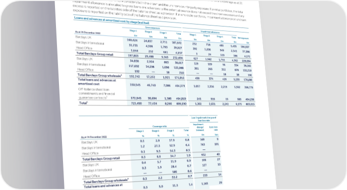 Strategic Shareholder Climate and Risk Financial Financial Barclays PLC 304 report information sustainability report Governance review review statements Annual Report 2022 Risk performance - Credit risk (continued) Expected Credit Losses Loans and advances at amortised cost by stage The table below presents a stage allocation and business segment analysis of loans and advances at amortised cost by gross exposure, impairment allowance, impairment charge and coverage ratio as at 31 December 2022. Also included are stage allocation of off- balance sheet loan commitments and financial guarantee contracts by gross exposure, impairment allowance and coverage as at 31 December 2022. Impairment allowance under IFRS 9 considers both the drawn and the undrawn counterparty exposure. For retail portfolios, the total impairment allowance is allocated to gross loans and advances to the extent allowance does not exceed the drawn exposure and any excess is reported on the liabilities side of the balance sheet as a provision. For wholesale portfolios, impairment allowance on undrawn exposure is reported on the liability side of the balance sheet as a provision. Loans and advances at amortised cost by stage (audited) Gross exposure Impairment allowance Stage 1 Stage 2 Stage 3 Total Stage 1 Stage 2 Stage 3 Total Net exposure As at 31 December 2022 £m £m £m £m £m £m £m £m £m Barclays UK 160,424 24,837 2,711 187,972 232 718 485 1,435 186,537 Barclays International 33,735 4,399 1,793 39,927 392 1,200 949 2,541 37,386 Head Office 3,644 252 661 4,557 3 24 359 386 4,171 Total Barclays Group retail 197,803 29,488 5,165 232,456 627 1,942 1,793 4,362 228,094 Barclays UK 34,858 2,954 805 38,617 129 109 96 334 38,283 Barclays International 117,692 14,298 1,098 133,088 301 265 312 878 132,210 Head Office 192 — 18 210 — — 18 18 192 a Total Barclays Group wholesale 152,742 17,252 1,921 171,915 430 374 426 1,230 170,685 Total loans and advances at amortised cost 350,545 46,740 7,086 404,371 1,057 2,316 2,219 5,592 398,779 Off-balance sheet loan commitments and financial b guarantee contracts 372,945 30,694 1,180 404,819 245 315 23 583 404,236 c Total 723,490 77,434 8,266 809,190 1,302 2,631 2,242 6,175 803,015 Loan impairment charge and loan loss rate Loan impairment Coverage ratio charge/ Loan loss Stage 1 Stage 2 Stage 3 Total (release) rate As at 31 December 2022 % % % % £m bps Barclays UK 0.1 2.9 17.9 0.8 169 9 Barclays International 1.2 27.3 52.9 6.4 763 191 Head Office 0.1 9.5 54.3 8.5 — Total Barclays Group retail 0.3 6.6 34.7 1.9 932 40 Barclays UK 0.4 3.7 11.9 0.9 106 27 Barclays International 0.3 1.9 28.4 0.7 127 10 Head Office — — 100 8.6 — a Total Barclays Group wholesale 0.3 2.2 22.2 0.7 233 14 Total loans and advances at amortised cost 0.3 5.0 31.3 1.4 1,165 29 Off-balance sheet loan commitments and financial b guarantee contracts 0.1 1.0 1.9 0.1 18 Other financial assets subject to c 37 impairment d Total 0.2 3.4 27.1 0.8 1,220 Notes a Includes Wealth and Private Banking exposures measured on an individual customer exposure basis, and excludes Business Banking exposures, including lending under the government backed Bounce Back Loan Scheme (BBLS) of £6.6bn that are managed on a collective basis and reported within BUK Retail. The net impact is a difference in total exposure of £3.8bn of balances reported as wholesale loans in the Loans and advances at amortised cost by product disclosure. b Excludes loan commitments and financial guarantees of £14.9bn carried at fair value. c Other financial assets subject to impairment not included in the table above include cash collateral and settlement balances, financial assets at fair value through other comprehensive income and other assets. These have a total gross exposure of £180.1bn and impairment allowance of £163m. This comprises £10m ECL on £178.4bn Stage 1 assets, £9m on £1.5bn Stage 2 fair value through other comprehensive income assets, other assets, cash collateral and settlement assets and £144m on £149m Stage 3 other assets. d The loan loss rate is 30bps after applying the total impairment charge of £1,220m