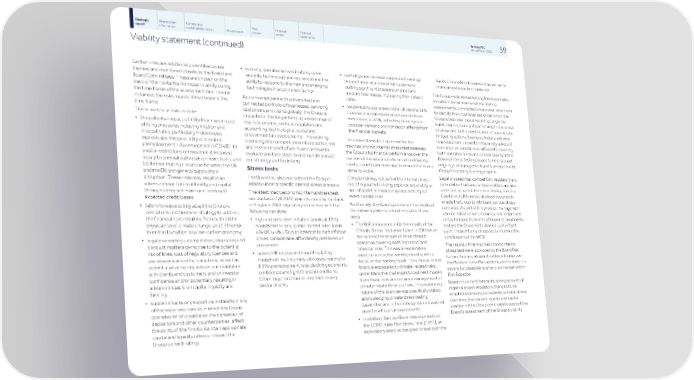 Strategic Shareholder Climate and Risk Financial Financial Barclays PLC 59 report information sustainability report Governance review review statements Annual Report 2022 Viability statement (continued) Certain risks are additionally identified as key ▪ evolving operational risks (notably cyber • cost of goods increase coupled with energy Bank's Climate Risk Framework as well as its themes and monitored closely by the Board and security, technology and resilience) and the price inflation at a time of falling demand financial resilience to climate risk. Board Committees. These are chosen on the ability to respond to the new and emerging putting significant pressure on small and The Group-wide stress testing framework also basis of their potential to impact viability during technologies in a controlled fashion. medium businesses, increasing their default includes internal reverse stress testing the time frame of the assessment but in some rates As a universal bank with a diversified and assessments, conducted once a year, which aim instances the risks may continue beyond this • residential house prices in the UK decline 31%. connected portfolio of businesses, servicing to identify the circumstances under which the time frame. Commercial real estate prices are stressed customers and clients globally, the Group is Group’s business model would no longer be These particular risks include: even more, at 45%, reflecting more cyclical impacted in the longer term by a wide range of viable, leading to a significant change in business occupier demand and contagion effects from ▪ the potential impact of: (i) further rises in cost macroeconomic, political, regulatory and strategy and to the identification of appropriate the financial markets. of living pressures including inflation and accounting, technological, social and mitigating actions. Examples include extreme interest rates, particularly in developed environmental developments. The evolving macroeconomic downturn (‘severely adverse’) The above stress test outcome for the scenarios, or specific one-off events, covering markets and the possibility of elevated operating environment presents opportunities macroeconomic internal stress test assesses unemployment; (ii) a resurgence in COVID-19 and risks in respect of which we continue to both operational risk and capital/liquidity items. the Group's full financial performance over the and/or restrictions on movement imposed evaluate and take steps to appropriately adapt Reverse stress testing is used to help support horizon of the scenario in terms of profitability, locally to combat outbreaks or new strains; and our strategy and its delivery. ongoing risk management and is an input to the capital, liquidity and leverage to ensure the Group (iii) further trading disruption between the UK Group’s recovery planning process. remains viable. Stress tests and the EU and general supply chain Legal proceedings, competition, regulatory and Climate risk was not part of the internal stress The Board has also considered the Group’s disruption. These risks may result in an remediation/redress conduct matters are also test this year but is being explored separately as viability under a specific internal stress scenario. adverse impact on profitability and capital assessed as part of the stress testing process. part of a pilot scenario analysis assessing tail through increased costs and increased The latest macroeconomic internal stress test, Capital and LRA are set at a level designed to event climate risks. expected credit losses conducted in Q4 2022, was informed by the Bank enable the Group to withstand various stress Additionally, the Board considered the results of of England 2022 regulatory stress test with the scenarios. As part of this process, management ▪ failure to successfully adapt the Group’s the following external climate-related stress following narrative: operations and business strategy to address also identified actions, including cost reductions tests: the financial risks resulting from both: (i) the and withdrawal from lines of business, available to • high and persistent inflation (peaks at 17%) • The BoE announced in Q2 the results of the physical risk of climate change; and (ii) the risk restore the Group to its desired capital flight coupled with rising global interest rates (peak Climate Stress Test undertaken in 2021 which from the transition to a low-carbon economy path. These internal stress tests informed the 6% UK, 6.5% US) in an attempt to curb inflation considered the impact of three climate conclusions of the WCR. drives considerable affordability pressures on ▪ legal proceedings, competition, regulatory and scenarios covering both 'transition' and customers conduct matters giving rise to the potential The results of the macroeconomic internal 'physical' risks. This was an exploratory risk of fines, loss of regulatory licences and stress test were approved by the Board Risk • severe UK recession brought by falling exercise across the banking industry with a permissions and other sanctions, as well as Committee and allowed the Board to approve household real incomes, job losses leading to focus on the banking book. The aim was to size potential adverse impacts on our reputation the Medium Term Plan as being able to sustain a 8.5% unemployment rate, declining economic financial exposures to climate-related risks, severe but plausible scenario and remain within with clients and customers and on investor confidence and tight financial conditions. understand the challenges to business models confidence and/or potentially resulting in Risk Appetite. Other major economies experience very from these risks and enhance management of adverse impacts on capital, liquidity and similar shocks Based on current forecasts, taking account of climate-related financial risks. The exploratory funding material known regulatory changes to be nature of the exercise was spe