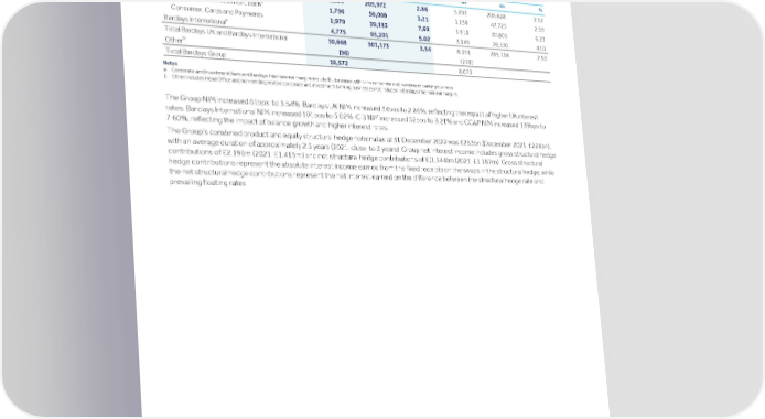 Strategic Shareholder Climate and Risk Financial Financial Barclays PLC 393 report information sustainability report Governance review review statements Annual Report 2022 Non-IFRS performance measures (continued) Margins analysis 2022 2021 Net interest Average customer Net interest Net interest Average customer Net interest income assets margin income assets margin £m £m % £m £m % For the year ended 31 December Barclays UK 5,893 205,972 2.86 5,202 206,628 2.52 a 1,796 56,008 3.21 1,238 47,725 2.59 Corporate and Investment Bank Consumer, Cards and Payments 2,979 39,193 7.60 1,911 30,805 6.21 a Barclays International 4,775 95,201 5.02 3,149 78,530 4.01 10,668 301,173 3.54 Total Barclays UK and Barclays International 8,351 285,158 2.93 b (96) Other (278) Total Barclays Group 10,572 8,073 Notes a Corporate and Investment Bank and Barclays International margins include IEL balances within the corporate and investment banking business. b Other includes Head Office and non-lending related corporate and investment banking businesses not included in Barclays International margins. The Group NIM increased 61bps to 3.54%. Barclays UK NIM increased 34bps to 2.86%, reflecting the impact of higher UK interest rates. Barclays International NIM increased 101bps to 5.02%. CIB NIM increased 62bps to 3.21% and CC&P NIM increased 139bps to 7.60%, reflecting the impact of balance growth and higher interest rates. The Group’s combined product and equity structural hedge notional as at 31 December 2022 was £263bn (December 2021: £228bn), with an average duration of approximately 2.5 years (2021: close to 3 years). Group net interest income includes gross structural hedge contributions of £2,196m (2021: £1,415m) and net structural hedge contributions of £(1,544)m (2021: £1,187m). Gross structural hedge contributions represent the absolute interest income earned from the fixed receipts on the swaps in the structural hedge, while the net structural hedge contributions represent the net interest earned on the difference between the structural hedge rate and prevailing floating rates.
