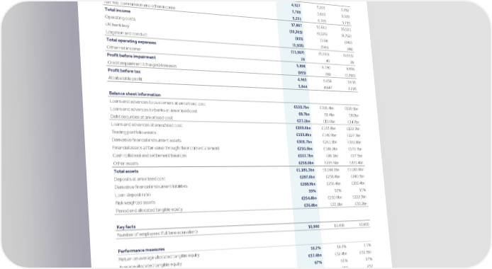 Strategic Shareholder Climate and Risk Financial Financial Barclays PLC 387 report information sustainability report Governance review review statements Annual Report 2022 Analysis of results by business (continued) Barclays International a Restated 2022 2021 2020 £m £m £m Income statement information Net interest income 4,927 3,263 3,282 Net trading income 7,709 5,693 6,920 Net fee, commission and other income 5,231 6,709 5,719 Total income 17,867 15,665 15,921 Operating costs (10,361) (9,076) (8,765) UK bank levy (133) (134) (240) Litigation and conduct (1,503) (345) (48) Total operating expenses (11,997) (9,555) (9,053) Other net income 28 40 28 Profit before impairment 5,898 6,150 6,896 Credit impairment (charges)/releases (933) 288 (3,280) Profit before tax 4,965 6,438 3,616 Attributable profit 3,844 4,647 2,220 Balance sheet information Loans and advances to customers at amortised cost £133.7bn £106.4bn £100.1bn Loans and advances to banks at amortised cost £8.7bn £8.4bn £8.0bn Debt securities at amortised cost £27.2bn £19.0bn £14.7bn Loans and advances at amortised cost £169.6bn £133.8bn £122.7bn Trading portfolio assets £133.8bn £146.9bn £127.7bn Derivative financial instrument assets £301.7bn £261.5bn £301.8bn Financial assets at fair value through the income statement £210.5bn £188.2bn £170.7bn Cash collateral and settlement balances £107.7bn £88.1bn £97.5bn Other assets £258.0bn £225.6bn £221.4bn Total assets £1,181.3bn £1,044.1bn £1,041.8bn Deposits at amortised cost £287.6bn £258.8bn £240.5bn Derivative financial instrument liabilities £288.9bn £256.4bn £300.4bn Loan: deposit ratio 59% 52% 51% Risk weighted assets £254.8bn £230.9bn £222.3bn Period end allocated tangible equity £36.8bn £33.2bn £30.2bn Key facts Number of employees (full time equivalent) 10,900 10,400 10,800 Performance measures Return on average allocated tangible equity 10.2% 14.4% 7.1% Average allocated tangible equity £37.6bn £32.4bn £31.5bn Cost: income ratio 67% 61% 57% Loan loss rate (bps) 54 (21) 257 Net interest margin 5.02% 4.01% 3.64% Note a 2021 financial and capital metrics have been restated to reflect the impact of the Over-issuance of Securities. See impact of Over-issuance of Securities on page 356 and Restatement of financial statements (Note 1a) on page 428 for further details.