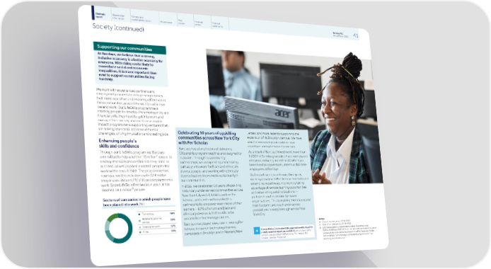 Strategic Shareholder Climate and Risk Financial Financial Barclays PLC 41 report information sustainability report Governance review review statements Annual Report 2022 Society (continued) Supporting our communities At Barclays, we believe that a strong, inclusive economy is a better economy for everyone. With rising costs likely to exacerbate social and economic inequalities, it is more important than ever to support communities facing hardship. We work with experienced partners and employability experts to design programmes that make a positive and enduring difference in the communities around the world in which we live and work. Our LifeSkills programme is enabling people to develop the employability and financial skills they need to get into work and manage their money and our Unreasonable Impact programme is supporting ventures that are solving key social and environmental Jersey, and more recently supporting the Celebrating 10 years of upskilling challenges, driving innovation and creating jobs. expansion of its Brooklyn campus. We have communities across New York City also helped develop curricula for Java Enhancing people’s with Per Scholas developer and cybersecurity courses. skills and confidence Barclays has a long history of delivering As a result of Barclays' investment, more than Through our LifeSkills programme, Barclays Citizenship programmes that are designed for a 1,800 Per Scholas graduates have been placed committed to help a further 10 million people to inclusion. Through its community into work, including more than 60 who have develop the skills and confidence they need to partnerships, we are upskilling and creating b been hired as apprentices, interns or full-time succeed, as well as place 250,000 people into pathways into work for Black and ethnically employees at Barclays. work by the end of 2022. The programme has diverse people, and working with ethnically now reached this milestone with 12.6 million As the partnership continues, Barclays is diverse leaders to promote social equity in people upskilled and 270,600 people placed into working closely with Per Scholas to create and our communities. work. Since LifeSkills first began in 2013, it has extend more pathways into work by taking In 2022, we celebrated 10 years of upskilling Δ reached 18.1 million people. advantage of remote learning opportunities historically underserved communities across and establishing satellite locations in New York City with LifeSkills partner Per Sectors of companies in which people have partnership with community-based Scholas, and continue to evolve this been placed into work (%) organisations. This is enabling them to expand partnership to empower even more of their their footprint and reach underserved learners – 87% of whom are Black and populations in every borough across New Technology 58% n ethnically diverse, with the skills to be York City. Retail and customer successful in technology careers. 15% n service Notes: Barclays has played a key role in helping Per Financial services 12% n a. Over a five-year period, 2018-2022. Scholas to launch technology training Other 15% b. Over a four-year period, 2019-2022. n You can find out more about this approach and its impact in Δ 2022 data subject to independent Limited Assurance under campuses in Brooklyn and in Newark, New + a newly launched report, accessible at: perscholas.org/wp- ISAE(UK)3000 and ISAE3410. Current and previous limited assurance content/uploads/2022/10/Partnering-For-Impact-Per- scope and opinions can be found within the ESG Resource Hub for Scholas-Satellite-Model.pdf further details: home.barclays/sustainability/esg-resource-hub/ reporting-and-disclosures/