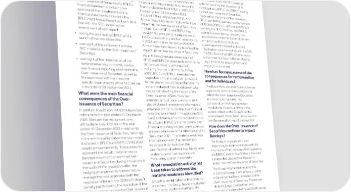 Strategic Shareholder Climate and Risk Financial Financial Barclays PLC 189 report information sustainability report Governance review review statements Annual Report 2022 Directors' report: Over-issuance of Securities – Shareholder Q&A (continued) • oversight of discussions with the How has Barclays reflected the Has Barclays been the subject of Group’s key regulators including the financial consequences of the any regulatory enforcement SEC, PRA, FCA and FRC Over-issuance of Securities in its action in relation to the Over- • engagement with Barclays’ shareholders financial statements? issuance of Securities? to discuss the Over-issuance of It was concluded that it was not necessary In September 2022, the SEC issued an Securities and Barclays’ response to it; or appropriate, under UK company law and order announcing the resolution of its • consideration of the implications of the financial reporting standards, to revise the investigation of BPLC and BBPLC relating Over-issuance of Securities for BPLC’s financial statements of BPLC or BBPLC for to the Over-issuance of Securities. financial statements, including the the year ended 31 December 2021 Pursuant to the terms of the resolution, approval of the restatement of the included in their respective 2021 UK BPLC and BBPLC paid a combined penalty 1 financial statements included in the Annual Report and Accounts to reflect the of $200m (£165m ) , without admitting or BPLC 2021 Annual Report on Form 20-F impact of the Over-issuance of Securities. denying the SEC’s findings, and BBPLC filed with the SEC, as well as the Instead, each of BPLC and BBPLC has agreed to undertakings requiring the amendment of such report restated the prior period comparatives in adoption and implementation of certain the Group’s quarterly and half-year results enhancements to controls and • noting the approval by BBPLC of the in 2022, and in their respective 2022 UK governance with respect to its shelf launch of the rescission offer; Annual Report and Accounts, to reflect the registration statements filed with the SEC. • oversight of the settlement with the impact of the Over-issuance of Securities. The SEC found that BBPLC’s previously SEC in relation to the Over-issuance of announced rescission offer satisfied its As a US foreign private issuer, each of Securities requirements for disgorgement and BPLC and BBPLC is required to file with the • oversight of the remediation of the prejudgment interest. SEC annual reports on Form 20-F, material weakness in internal control including financial statements. In May How has Barclays assessed the over financial reporting which led to the 2022, BPLC and BBPLC amended their consequences for remuneration Over-issuance of Securities, as well as respective annual reports on Form 20-F the work required to address the and for individuals? for the year ended 31 December 2021 to specific requirements of the SEC set out The Board Remuneration Committee has include restated financial statements for in its order of 29 September 2022. adjusted its remuneration decisions to this period reflecting the impact of the reflect the Over-issuance of Securities, What were the main financial Over-issuance of Securities. Such and in doing so has taken into consequences of the Over- amended annual reports on Form 20-F consideration the financial impact, also disclosed the existence of a material issuance of Securities? reputational impacts and how these weakness in internal control over financial In addition to a £0.2bn net attributable loss events reflect on the Group’s control reporting (as defined in the applicable SEC referable to the year ended 31 December environment. More detail can be found in rules) and management’s conclusions that 2021, Barclays has recognised a net the Remuneration report on page 201. BPLC’s and BBPLC’s internal control over attributable loss of £0.6bn in the year financial reporting and disclosure controls How does the Over-issuance of ended 31 December 2022 in relation to and procedures were not effective as at 31 Securities continue to impact the Over-issuance of Securities, materially December 2021. The material weakness in line with the anticipated financial impact Barclays? that had been identified related to a disclosed in BPLC’s and BBPLC’s H1 2022 The Group is engaged with, and weakness in controls over the results announcements. These amounts responding to inquiries and requests for identification of external regulatory limits represent the net attributable loss to information from, various other regulators related to securities issuance and Barclays in connection with the Over- and BBPLC and/or its affiliates is involved monitoring against these limits. issuance of Securities, taking into account in purported class action litigation in the costs of the rescission offer, the What remediation activity has relation to the Over-issuance of Securities. hedging arrangements entered into to been taken to address the The Group may face other potential manage the risks associated with the material weakness identified? private civil claims, class actions or other 1 rescission offer and the $200m (£165m ) enforcement actions in relation to the Since the identification of this material penalty paid following the resolution of the Over-issuance of Securities. Please see weakness, the Group has strengthened SEC’s investigation into the Over-issuance the internal controls relating to the Note 26 (Legal, competition and of Securities (see below for further detail). tracking of issuance programme limits regulatory matters) to the audited financial through the implementation and statements for the year ended 31 strengthening of a series of controls December 2022 for further information. across the Group, together with central governance. Accordingly, as at 31 Note: December 2022, management concluded 1 Exchange rate USD/GBP 1.22 as at 30 June 2022 that the previously disclosed m