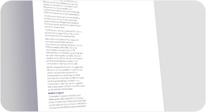 Strategic Shareholder Climate and Risk Financial Financial Barclays PLC 196 report information sustainability report Governance review review statements Annual Report 2022 Directors’ report: Other statutory and regulatory information (continued) The Directors are also responsible for preparing a Strategic report, Directors’ report, Directors’ Remuneration report and Corporate Governance Statement in accordance with applicable law and regulations. The Directors are responsible for the maintenance and integrity of the Annual Report and Financial Statements as they appear on our website. Legislation in the UK governing the preparation and dissemination of financial statements may differ from legislation in other jurisdictions. The Directors have a general responsibility for taking such steps as are reasonably open to them to safeguard the assets of the Group and to prevent and detect fraud and other irregularities. The Directors, whose names and functions are set out on pages 143 to 146, confirm to the best of their knowledge that: (a) the financial statements, prepared in accordance with (i) UK-adopted international accounting standards; and (ii) IFRS as issued by the IASB, including interpretations issued by the IFRS Interpretations Committee, give a true and fair view of the assets, liabilities, financial position and profit or loss of the Company and the undertakings included in the consolidation taken as a whole; and (b) the management report, on pages 2 to 68, which is incorporated in the Directors’ report, includes a fair review of the development and performance of the business and the position of the Company and the undertakings included in the consolidation taken as a whole, together with a description of the Principal Risks and uncertainties that they face. Auditor’s report The Auditor’s report on the Financial Statements of Barclays PLC for the year ended 31 December 2022 was unmodified and its statement under Section 496 of the Companies Act 2006 was also unmodified. By order of the Board Stephen Shapiro Company Secretary 14 February 2023 Registered in England. Company No. 48839 Registered office: 1 Churchill Place, London E14 5HP