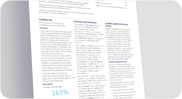 Strategic Shareholder Climate and Risk Financial Financial Barclays PLC 344 report information sustainability report Governance review review statements Annual Report 2022 Risk performance - Treasury and Capital risk (continued) Page Interest rate risk in the banking book performance A description of the non-traded market risk framework is provided. Net interest income sensitivity 364 – by business unit 364 The Group discloses a sensitivity analysis on pre-tax net interest income for non- trading financial assets and liabilities. The analysis is carried out by business unit and – by currency 365 currency. Analysis of equity sensitivity 365 The Group measures some non-traded market risks, in particular prepayment, Volatility of the FVOCI portfolio in the liquidity pool 365 recruitment, and residual risk using an economic capital methodology. The Group discloses the overall impact of a parallel shift in interest rates on other comprehensive income and cash flow hedges. The Group measures the volatility of the value of the FVOCI instruments in the liquidity pool through non-traded market risk VaR. Liquidity risk Summary of performance Liquidity Liquidity risk stress testing All disclosures in this section are The liquidity pool at £318bn (December unaudited unless otherwise stated. 2021: £291bn) reflects the Group’s Barclays’ Liquidity Risk is managed within prudent approach to liquidity the Principal Risk: Treasury and Capital Overview management. The Liquidity Coverage Risk Framework. Under this framework, The Group Liquidity Risk is managed within Ratio (LCR) remained well above the 100% the Group has established a liquidity risk Treasury and Capital Risk framework that regulatory requirement at 165% appetite together with the appropriate meets the PRA standards and is designed (December 2021: 168%), equivalent to a limits for the management of the liquidity to maintain liquidity resources that are surplus of £117bn (December 2021: risk. This is the level of liquidity risk the sufficient in amount and quality, and a £116bn). Group chooses to take in pursuit of its funding profile that is appropriate to meet the Group’s Liquidity Risk Appetite. The business objectives and in meeting its The increase in the liquidity pool over the liquidity risk framework is delivered via a regulatory obligations. The Group sets its year was driven by continued deposit combination of policy formation, review internal liquidity risk appetite based on growth and an increase in wholesale and governance, analysis, stress testing, internal liquidity risk stress tests and, funding, partly offset by an increase in limit setting and monitoring. external regulatory requirements namely business funding consumption. An This section provides an analysis of the the Liquidity Coverage Ratio (LCR) and increase in net stress outflows and Group’s: (i) summary of performance, (ii) Net Stable Funding Ratio (NSFR). trapped liquidity within Barclays’ liquidity risk stress testing, iii) liquidity subsidiaries led to a modest reduction in Liquidity risk appetite (LRA) regulation, iv) liquidity pool, (v) funding the LCR ratio. The Net Stable Funding The internal liquidity risk stress test structure and funding relationships, (vi) Ratio (average of last four quarter ends) measures the potential contractual and credit ratings, and (vii) contractual was 137%, which represents £155bn contingent stress outflows under a range maturity of financial assets and liabilities. surplus above 100% regulatory of internally defined stress scenarios, For further detail on liquidity risk requirement. which are then used to determine the size governance and framework, refer to During the year, the Group issued £15bn of the liquidity pool that is immediately pages 156 to 163 of the Barclays PLC Pillar of minimum requirement for own funds available to meet anticipated outflows 3 Report 2022 (unaudited). and eligible liabilities (MREL) instruments in should a stress occur. Key metrics a range of tenors and currencies. As part of the LRA, the Group runs four Liquidity Coverage Ratio Barclays Bank PLC continued to issue in liquidity stress scenarios, aligned to the the shorter-term and medium-term PRA’s prescribed stresses: markets and Barclays Bank UK PLC • 90 days market-wide stress event 165% continued to issue in the shorter-term • 30 days Barclays-specific stress event markets and maintain active secured • 30 days combined market-wide and funding programmes. This funding a Net Stable Funding Ratio Barclays-specific stress event capacity enables the respective entities to maintain their stable and diversified • 12 months market wide stress funding bases. 137% The Group’s reliance on short-term a Average represents the last four spot quarter end positions wholesale funding, as measured by the proportion of wholesale funding maturing in less than one year decreased year-on- year to 39% (December 2021: 40%).