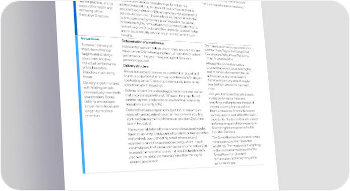 Strategic Shareholder Climate and Risk Financial Financial Barclays PLC 210 report information sustainability report Governance review review statements Annual Report 2022 Remuneration report (continued) Element and purpose Operation Maximum value and performance measures Benefits Executive Directors’ benefits provision includes, but is not The maximum value of benefits is restricted to, private medical cover, annual health check, life determined by the nature of the benefit To provide a competitive and ill health income protection, and use of a Company vehicle itself and costs of provision may depend and cost-effective and driver when required for business purposes (including any on external factors, e.g. insurance costs. benefits package tax liabilities that may arise from these benefits). There are no performance measures. appropriate to the role If an Executive Director relocates to perform their role, and reflecting local additional support may be provided for a defined and limited market practice, and to period of time, in line with Barclays’ general employee mobility support the health and policies and practices. This would include, but is not restricted wellbeing of the to, the provision of temporary accommodation, tax advice, Executive Directors. home leave flights, removals assistance and relocation flights for the Executive Director and their dependents as well as tax and/or social security costs arising in connection with such benefits. Annual bonus Determination of annual bonus The maximum annual bonus opportunity is 93% of Fixed Pay for the Group Chief Individual bonuses are entirely discretionary and decisions are To reward delivery of Executive and 90% of Fixed Pay for the based on the Committee’s judgement of Executive Directors’ short-term financial Group Finance Director. performance in the year, measured against Group and targets and strategic personal objectives. Although the Committee takes a objectives, and the structured approach to considering the individual performance Delivery structure level of bonus outcome each year, as of the Executive Annual bonuses are delivered as a combination of cash and outlined below, any bonus award is Directors in achieving shares, a proportion of which may be deferred and/or subject discretionary and any amount may be those. to a holding period. Clawback provisions apply to the bonus awarded from zero to the maximum Delivery in part in shares (described later in this policy). value. with holding periods Deferral proportions and vesting profiles will be structured so Each year, the Committee sets forward- increases alignment with that, in combination with any LTIP award, the proportion of looking performance measures, shareholders. Bonus variable pay that is deferred is no less than that required by weightings and targets near the start of deferral encourages regulations (currently 60%). the year, covering financial and non- longer-term focus and Deferred bonuses are granted subject to the relevant plan financial measures. Financial factors will longer-term share rules, with vesting subject to certain requirements including normally guide at least 60% of the bonus retention. continued employment and the malus provisions (described opportunity. The Committee will consider later in this policy). performance against those measures in determining the annual bonus for the The number of deferred bonus shares to be awarded may be Executive Directors. based on a share price discounted by reference to an expected dividend yield over the vesting period, where dividend The Committee has the discretion to vary equivalents cannot be awarded due to regulations. In such the measures and their respective circumstances, the Committee has discretion to reduce (not weightings. The measures and weightings increase) the number of shares that vest if actual dividends will be disclosed annually as part of the paid over the period are materially lower than the original Annual Report on Directors’ dividend assumption. remuneration, at the beginning of the performance year.
