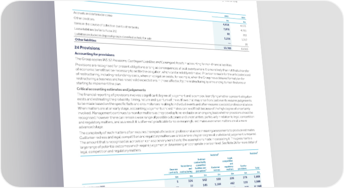 Strategic Shareholder Climate and Risk Financial Financial Barclays PLC 477 report information sustainability report Governance review review statements Annual Report 2022 Notes to the financial statements (continued) Accruals, provisions, contingent liabilities and legal proceedings Accruals, provisions, contingent liabilities and legal proceedings The notes included in this section focus on the Group’s accruals, provisions and contingent liabilities. Provisions are recognised for present obligations arising as consequences of past events where it is probable that a transfer of economic benefit will be necessary to settle the obligation, and it can be reliably estimated. Contingent liabilities reflect potential liabilities that are not recognised on the balance sheet. 23 Other liabilities 2022 2021 £m £m Accruals and deferred income 4,618 4,173 Other creditors 7,870 4,793 Items in the course of collection due to other banks 85 202 Lease liabilities (refer to Note 21) 1,216 1,317 Liabilities included in disposal groups classified as held for sale — 20 Other liabilities 13,789 10,505 24 Provisions Accounting for provisions The Group applies IAS 37 Provisions, Contingent Liabilities and Contingent Assets in accounting for non-financial liabilities. Provisions are recognised for present obligations arising as consequences of past events where it is more likely than not that a transfer of economic benefit will be necessary to settle the obligation, which can be reliably estimated. Provision is made for the anticipated cost of restructuring, including redundancy costs, when an obligation exists; for example, when the Group has a detailed formal plan for restructuring a business and has raised valid expectations in those affected by the restructuring by announcing its main features or starting to implement the plan. Critical accounting estimates and judgements The financial reporting of provisions involves a significant degree of judgement and is complex. Identifying whether a present obligation exists and estimating the probability, timing, nature and quantum of the outflows that may arise from past events requires judgements to be made based on the specific facts and circumstances relating to individual events and often requires specialist professional advice. When matters are at an early stage, accounting judgements and estimates can be difficult because of the high degree of uncertainty involved. Management continues to monitor matters as they develop to re-evaluate on an ongoing basis whether provisions should be recognised, however there can remain a wide range of possible outcomes and uncertainties, particularly in relation to legal, competition and regulatory matters, and as a result it is often not practicable to make meaningful estimates even when matters are at a more advanced stage. The complexity of such matters often requires the input of specialist professional advice in making assessments to produce estimates. Customer redress and legal, competition and regulatory matters are areas where a higher degree of professional judgement is required. The amount that is recognised as a provision can also be very sensitive to the assumptions made in calculating it. This gives rise to a large range of potential outcomes which require judgement in determining an appropriate provision level. See Note 26 for more detail of legal, competition and regulatory matters. b b Restated Restated Undrawn Legal, contractually competition Redundancy committed and Onerous and facilities and Customer regulatory Sundry a contracts restructuring guarantees redress matters provisions Total £m £m £m £m £m £m £m 5 326 542 530 226 279 1,908 As at 1 January 2022 Additions — 77 145 1,184 462 120 1,988 Amounts utilised (2) (186) — (1,393) (557) (60) (2,198) Unused amounts reversed (3) (88) (128) (94) (15) (64) (392) Exchange and other movements — 7 24 151 43 13 238 As at 31 December 2022 — 136 583 378 159 288 1,544 Notes a Undrawn contractually committed facilities and guarantees provisions are accounted for under IFRS 9. b 2021 financial metrics have been restated to reflect the impact of the Over-issuance of Securities. See Restatement of financial statements (Note 1a) on page 428 for further details. Provisions expected to be recovered or settled within no more than 12 months after 31 December 2022 were £1,348m (2021: £1,754m). Onerous contracts Onerous contract provisions comprise an estimate of unavoidable costs involved with fulfilling the terms and conditions of contracts net of any expected benefits to be received.